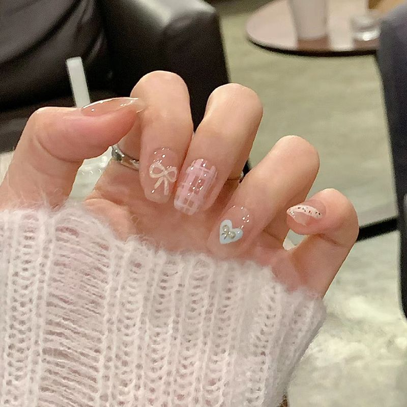 碎花樱桃半手工美甲夏日少女贴片石膏蝴蝶结可爱新款穿戴指甲学生