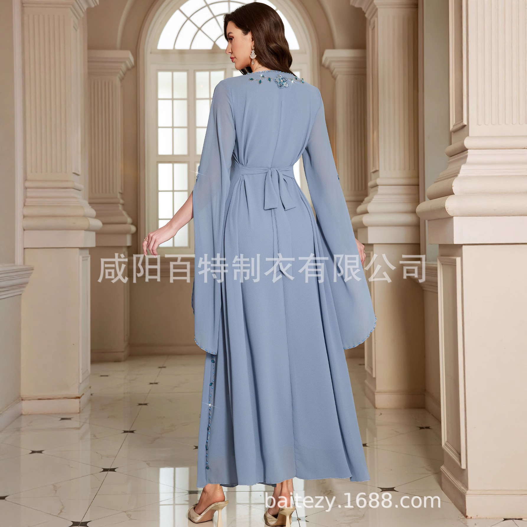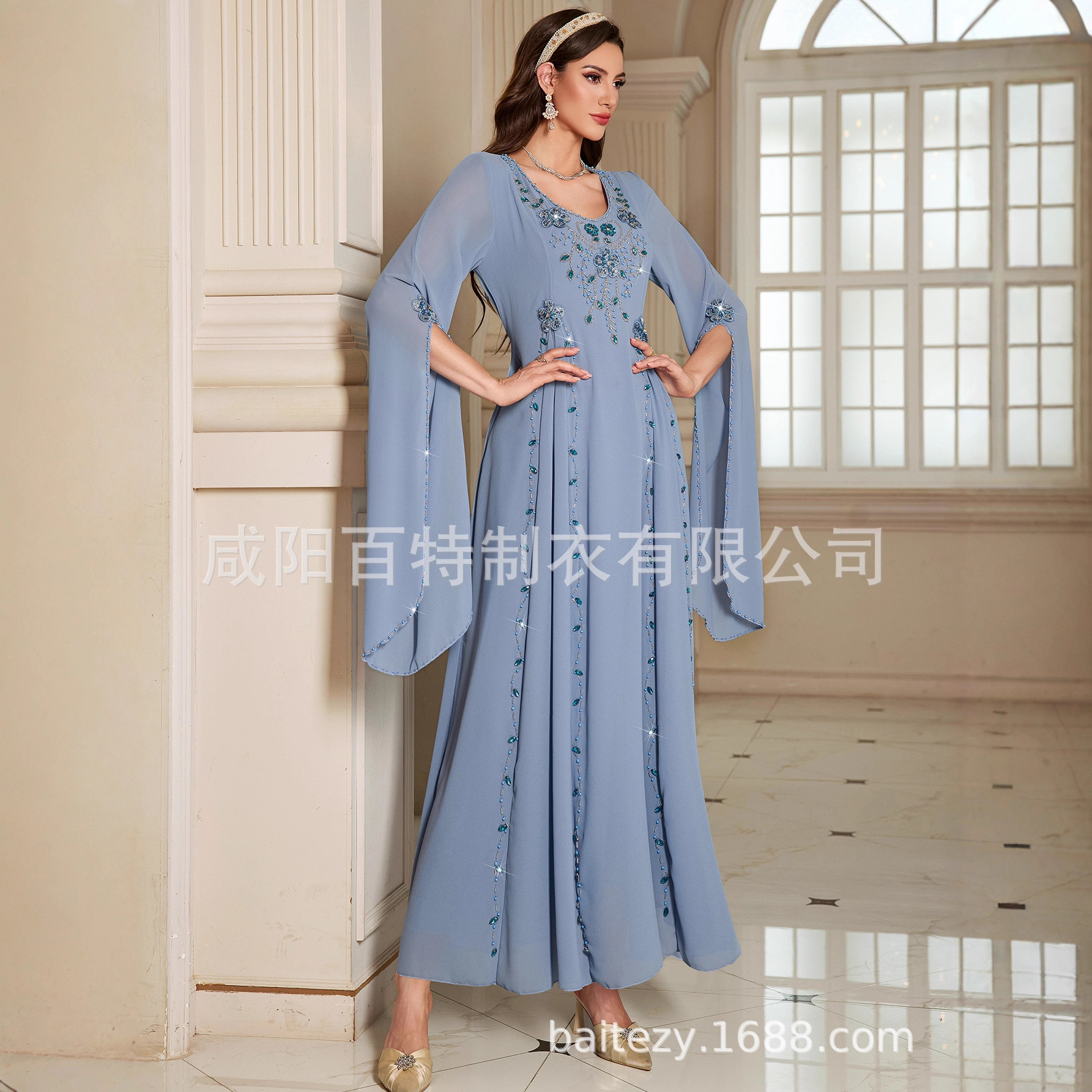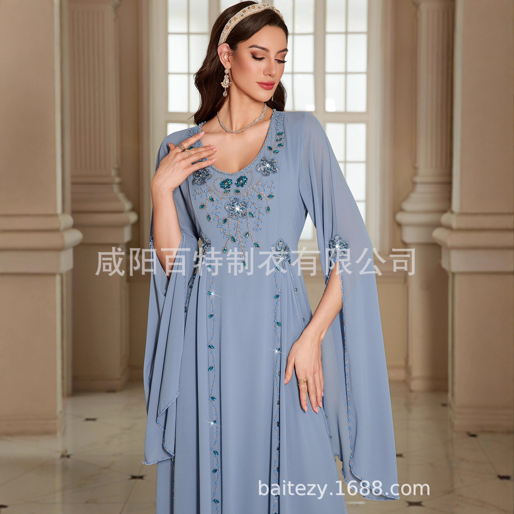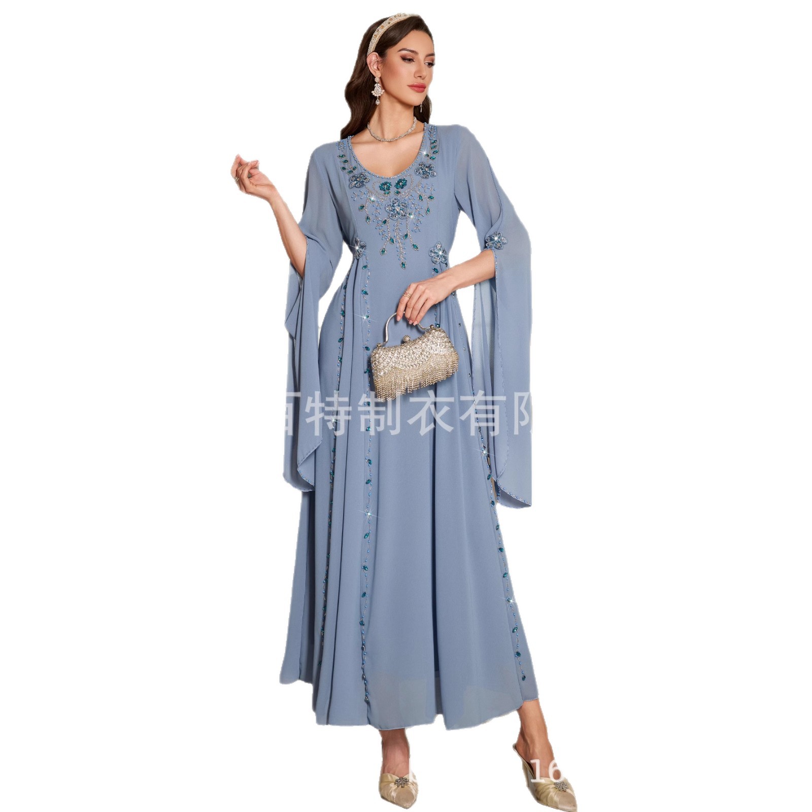 雾蓝色中东服饰长袍手工钉珠长裙时尚礼服连衣裙长袖气质优雅礼服