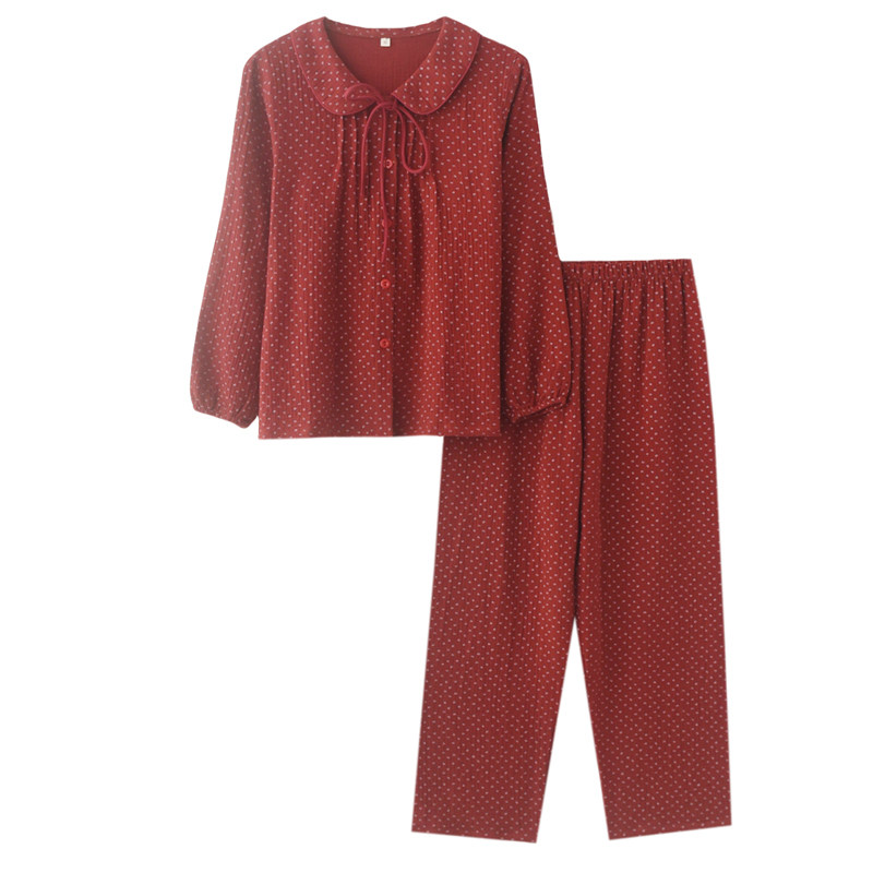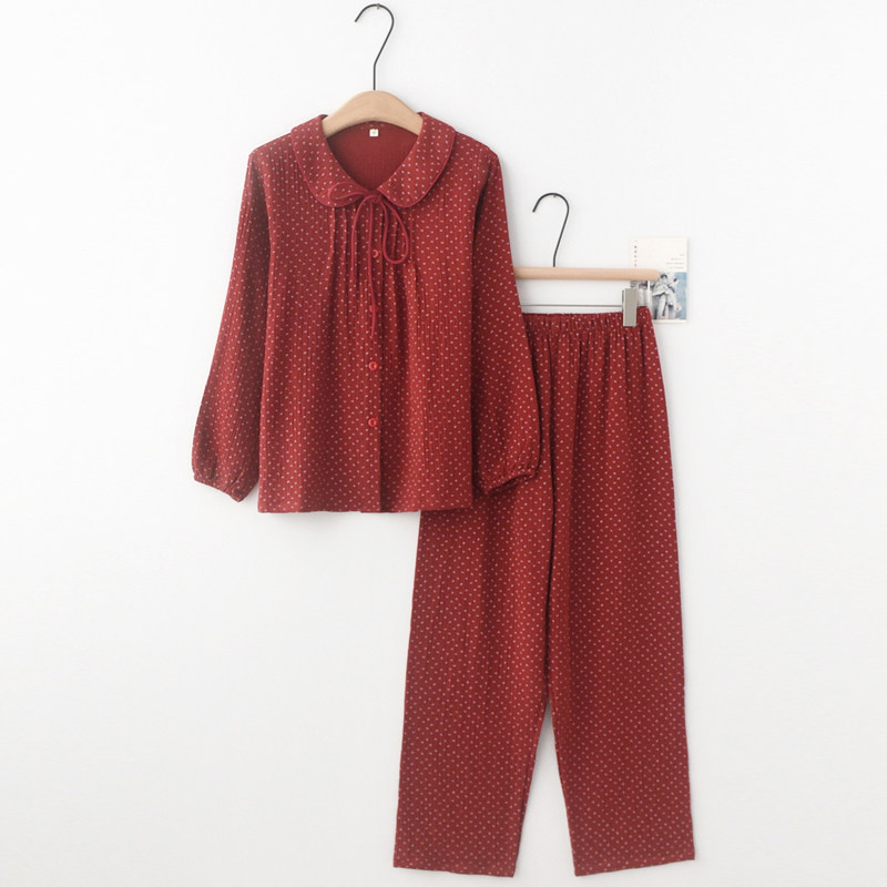 红色本命年甜美印花睡衣女款春夏季纯棉纱布薄长袖长裤家居服套装