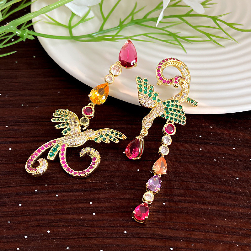 时尚民族风轻奢创意不对称凤凰微镶锆石耳环时尚气质长款水滴耳饰