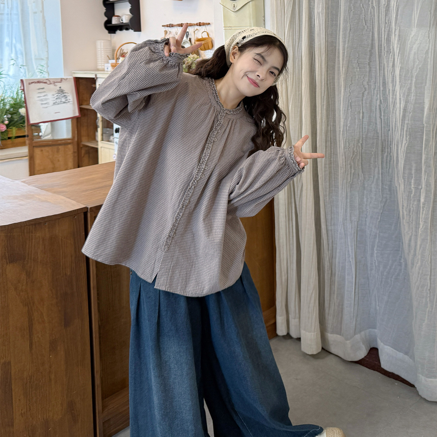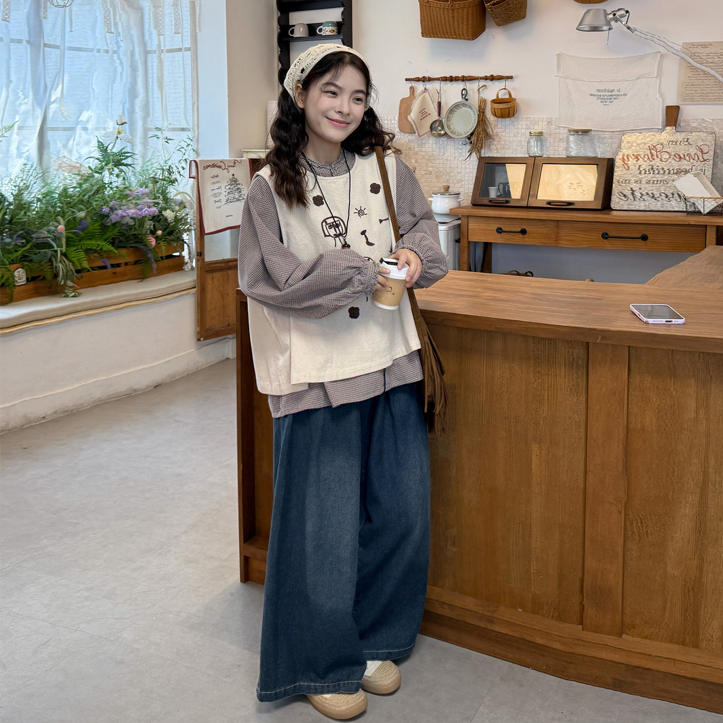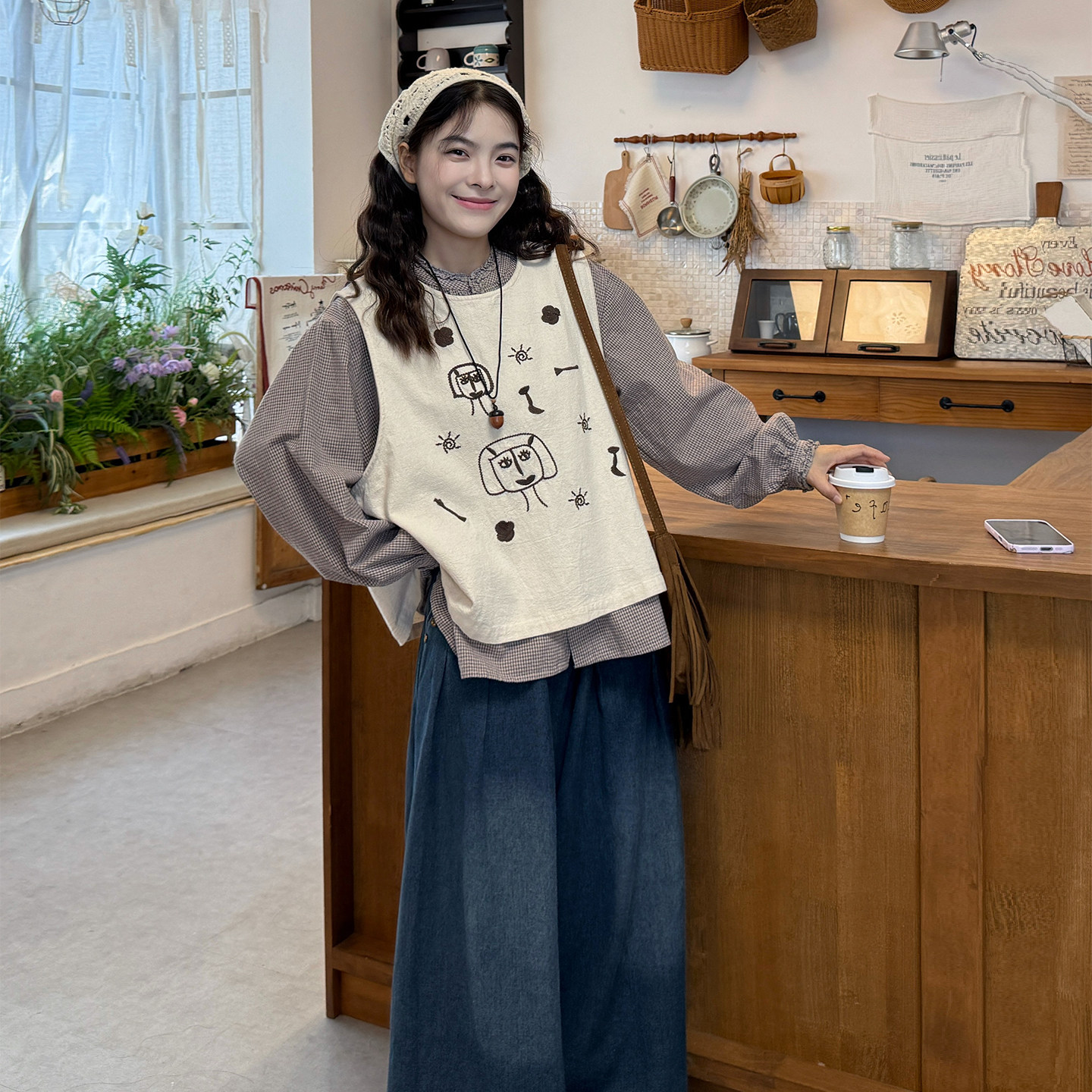 大码女装春季新宽松格纹长袖衬衫+叠穿刺绣马甲背心+牛仔裤三件套
