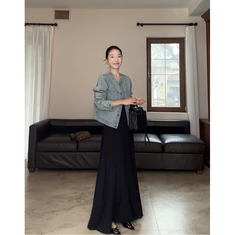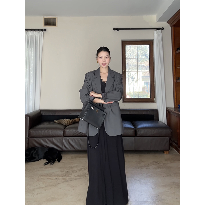 【郭九九呢】V领蕾丝修身显瘦弹力针织小黑裙连衣裙休闲西装外套