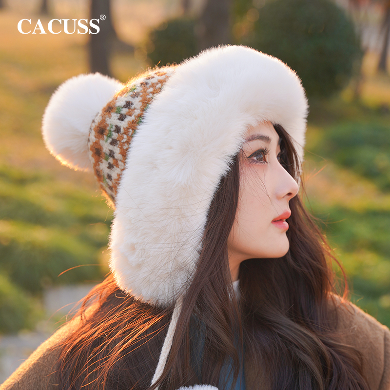 CACUSS帽子女秋冬护耳红色毛线帽骑行加厚雷锋帽户外保暖防风防寒