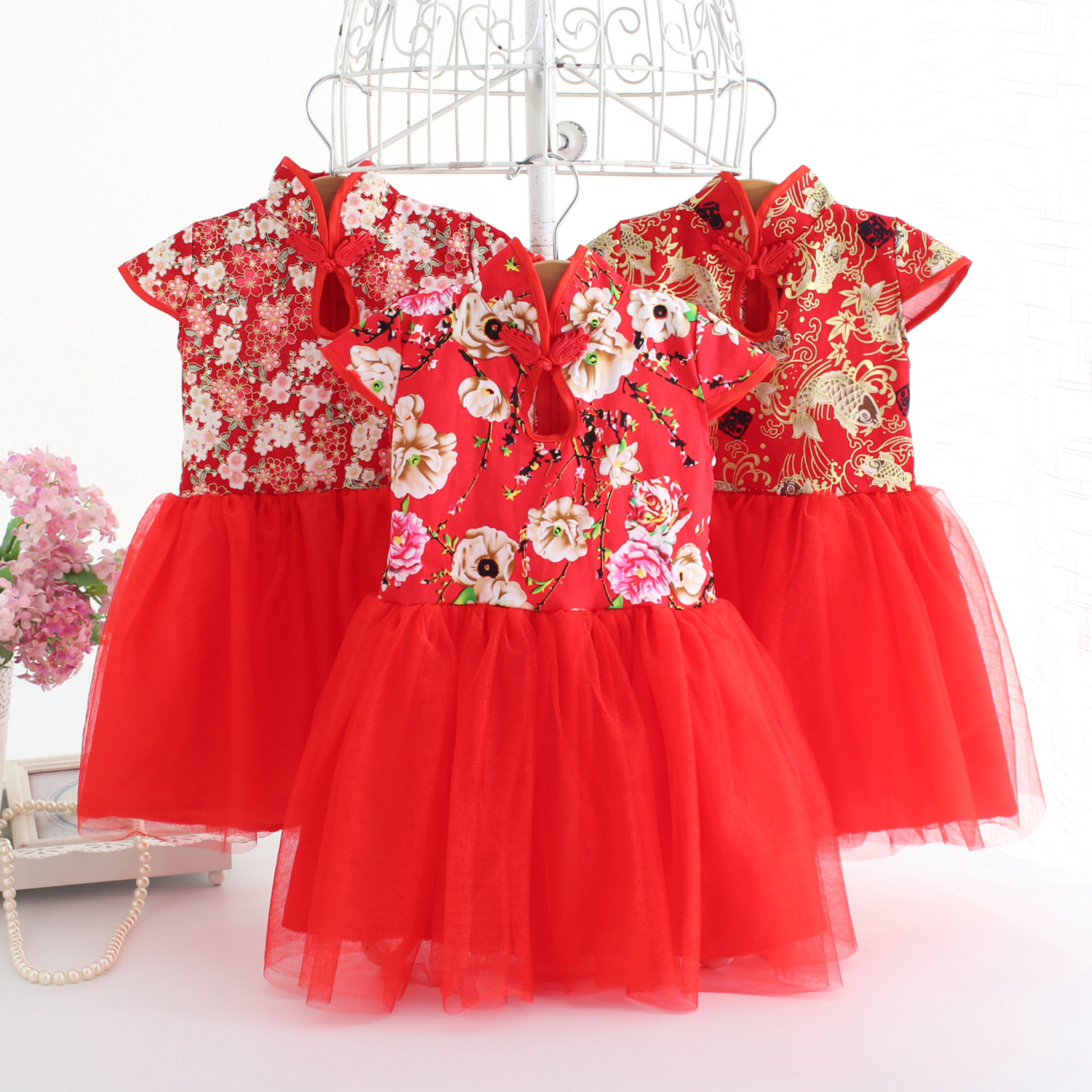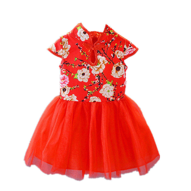 女童旗袍公主裙夏装儿童连衣裙宝宝纱裙大红花童生日喜庆过年礼服