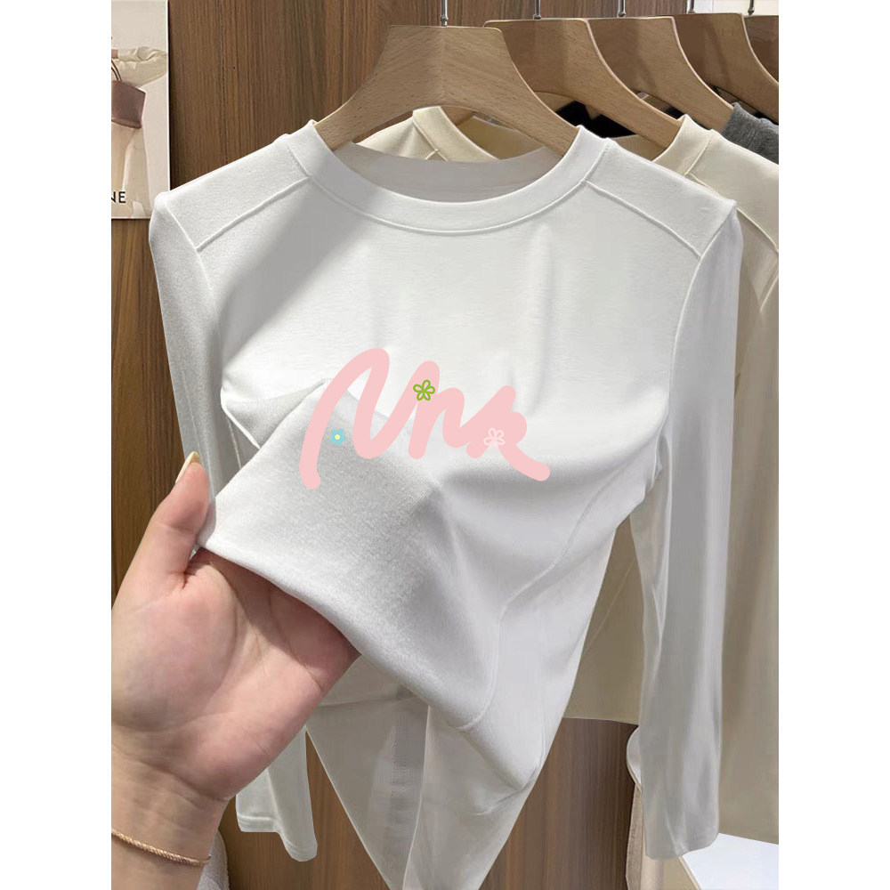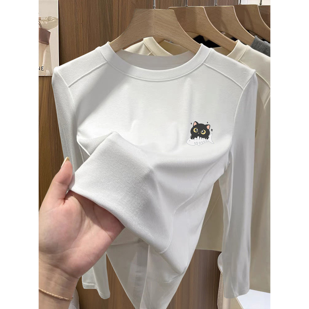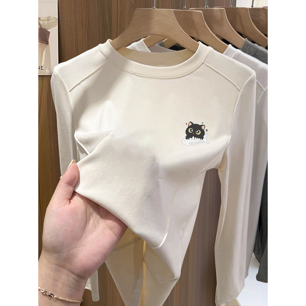 韩系chic别致圆领长袖T恤女秋季趣味印花打底衫大码胖mm宽松上衣