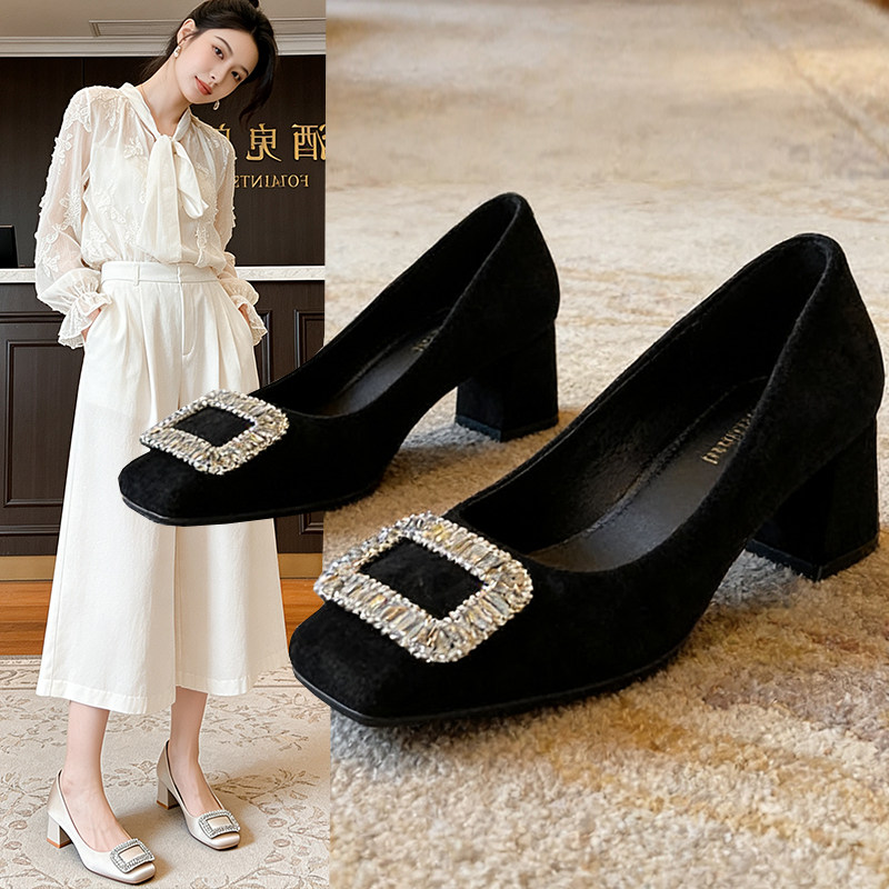 法式水钻方扣2026春季女鞋浅口高跟鞋女一脚蹬粗跟通勤温柔单鞋女