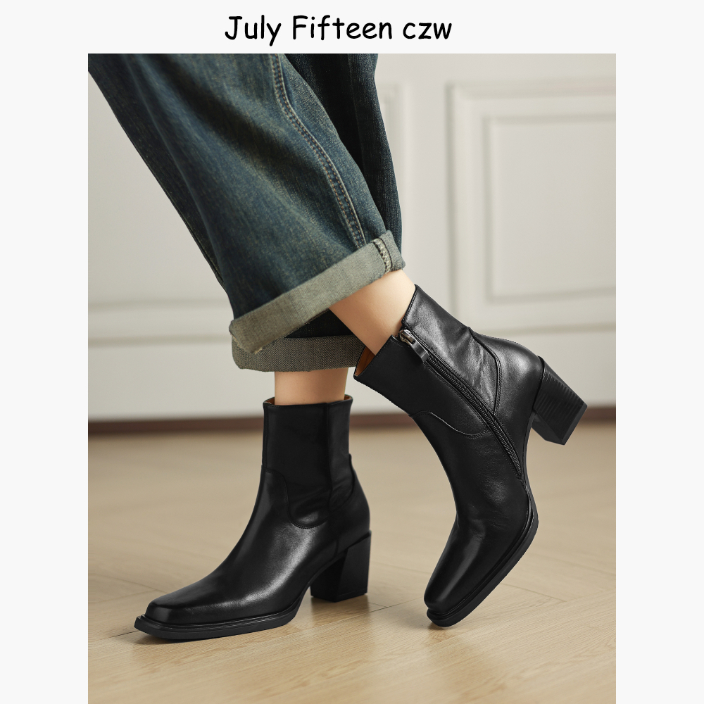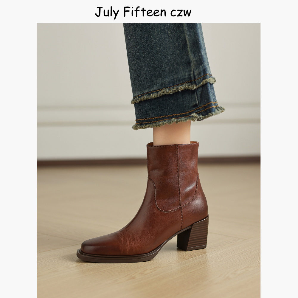 头层牛皮~英伦复古方头粗跟侧拉链短靴女2025新款百搭高跟马丁靴