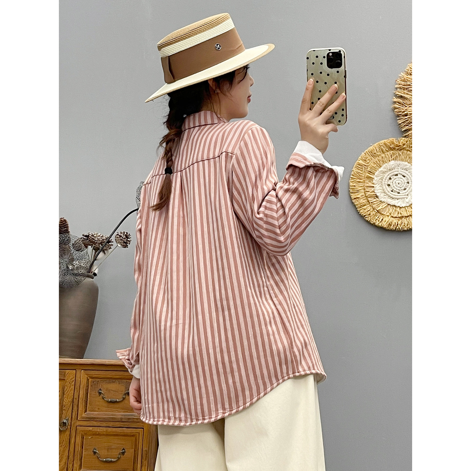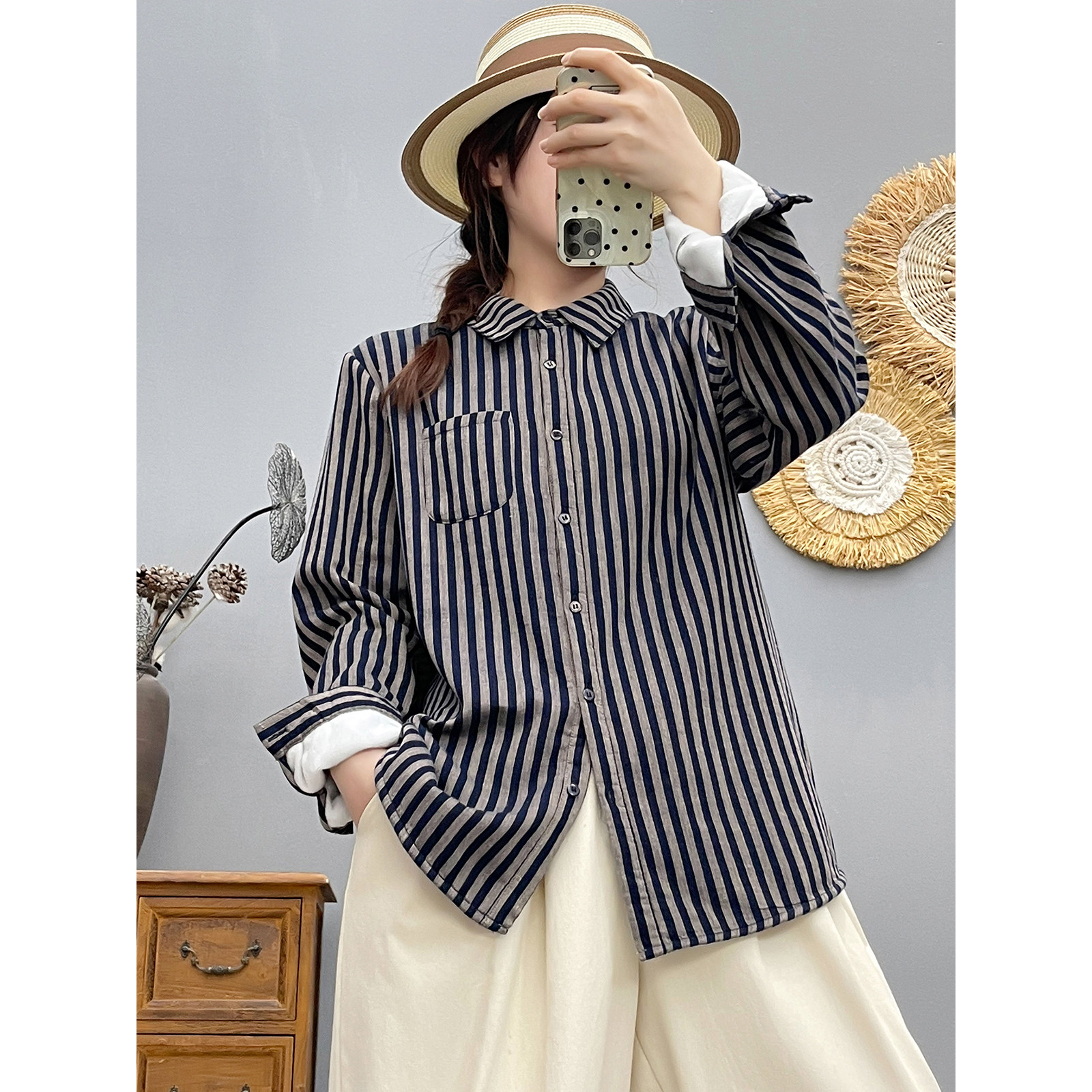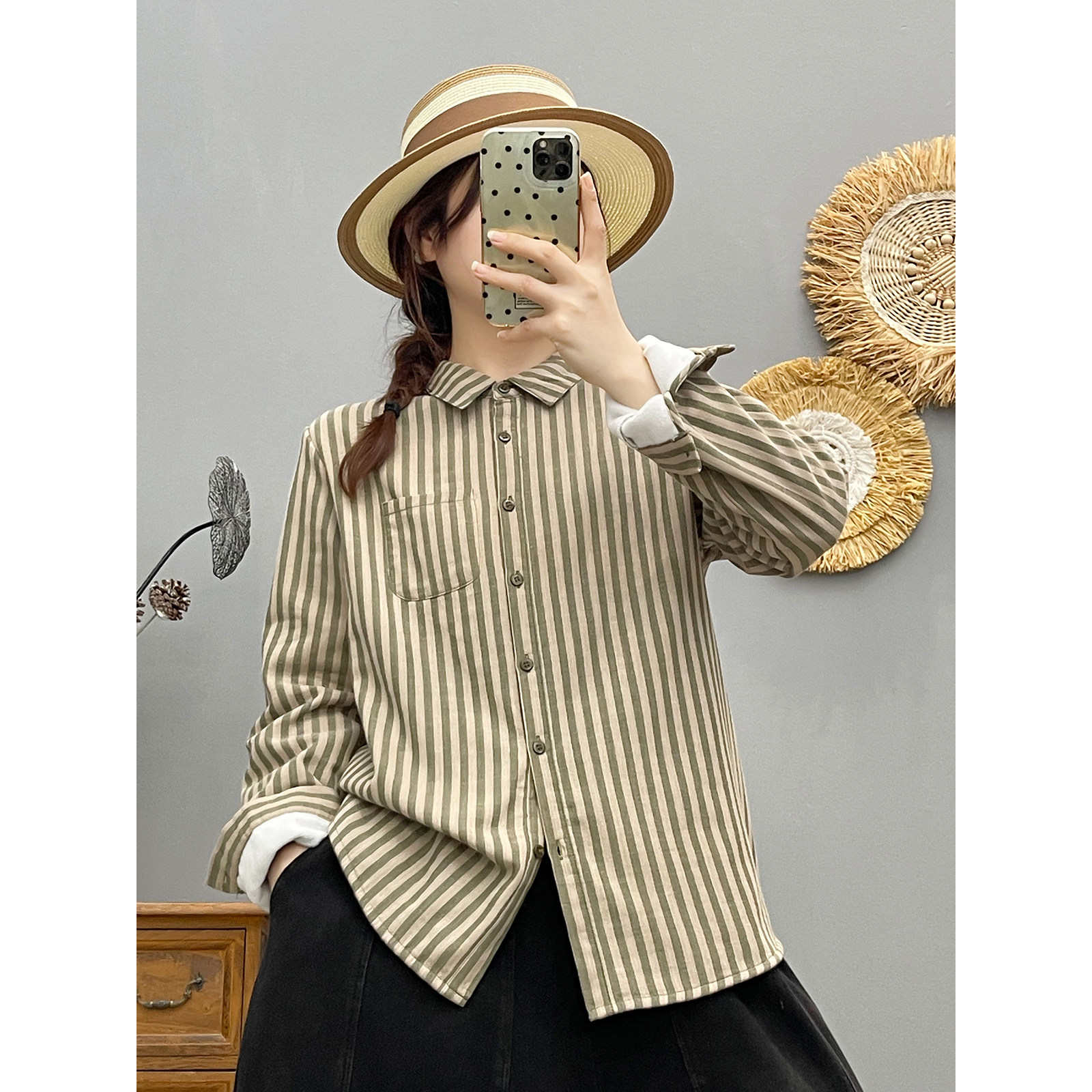 秋冬新款复古加厚加绒长袖衬衫女休闲方领条纹纯棉上衣保暖衬衣女