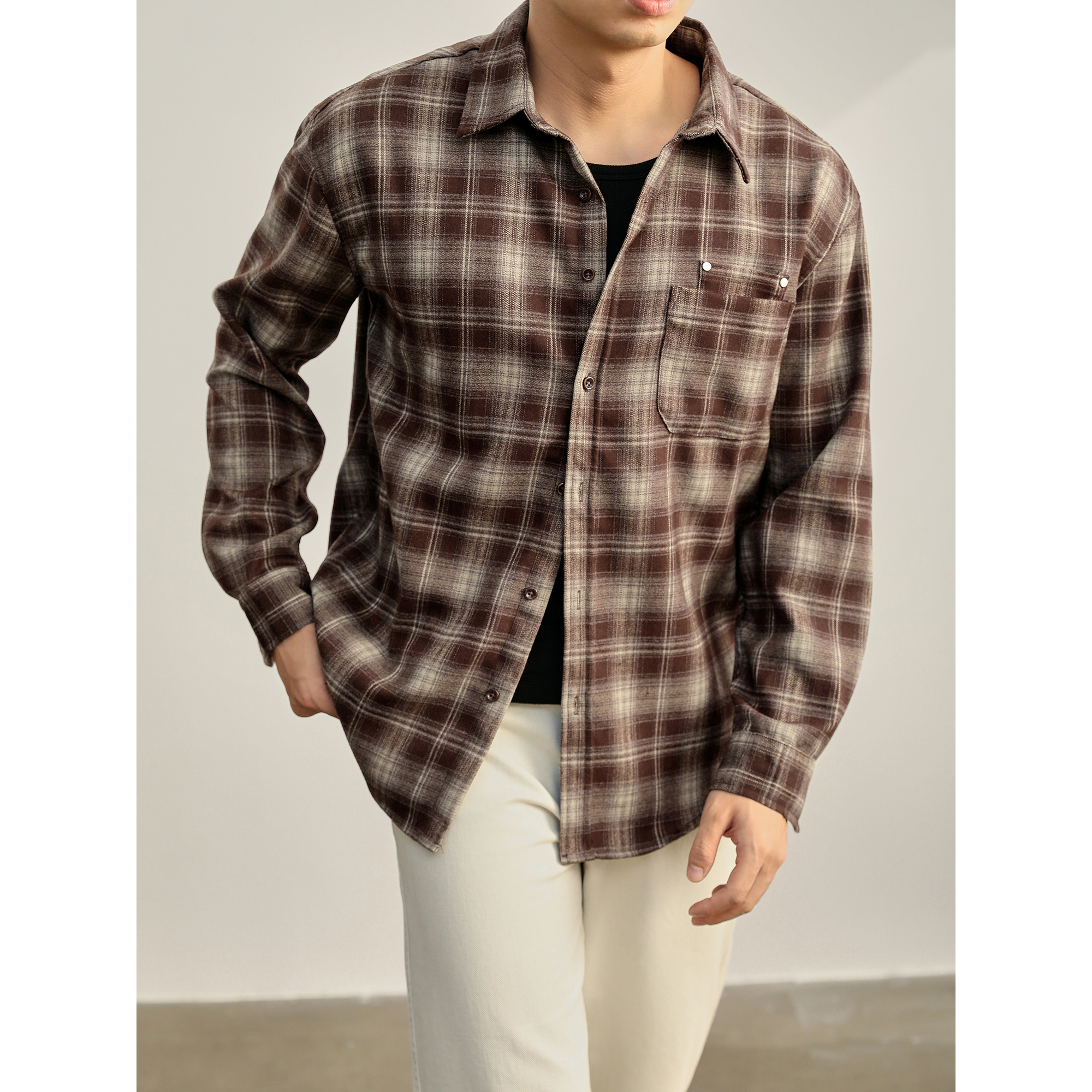LUUD 细微绒磨毛纯棉宽松落肩衬衣撞色潮流大格子休闲衬衫外套男