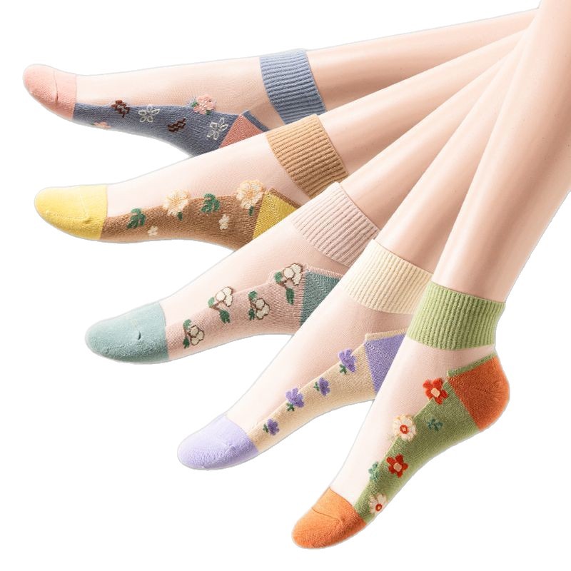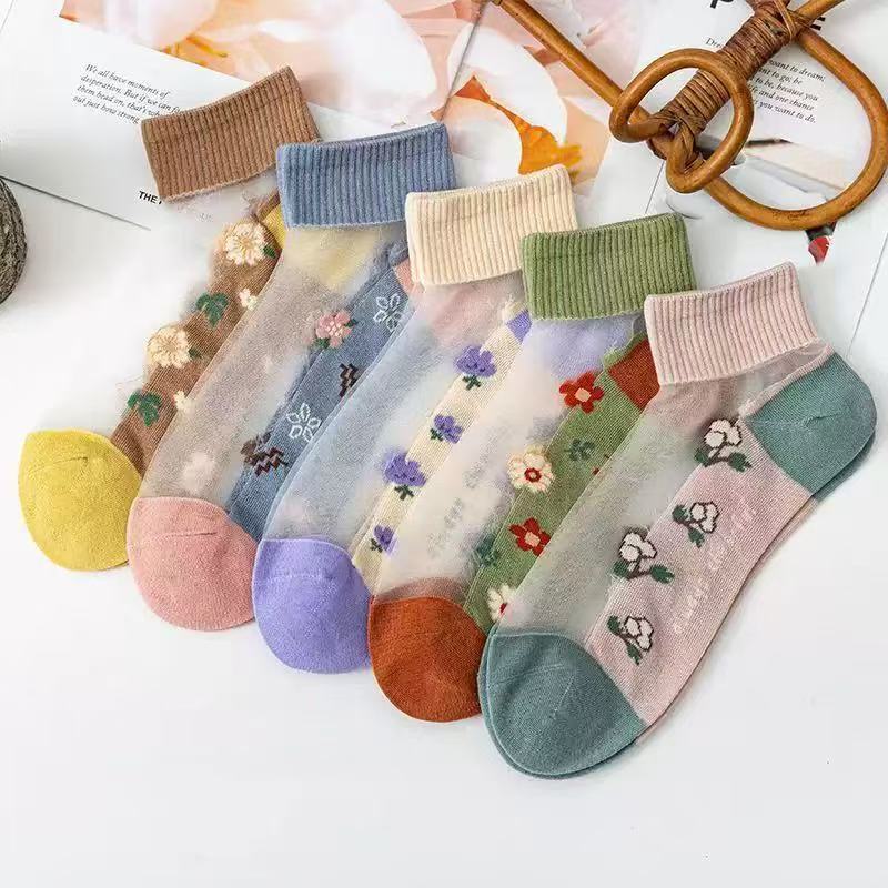 夏季薄款袜子女绣花卡丝水晶短袜
