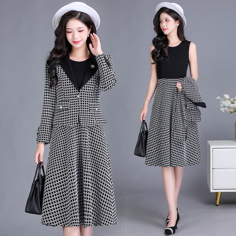 现货速发格子小西服套装连衣裙2025春秋新款气质复古名媛风减龄套