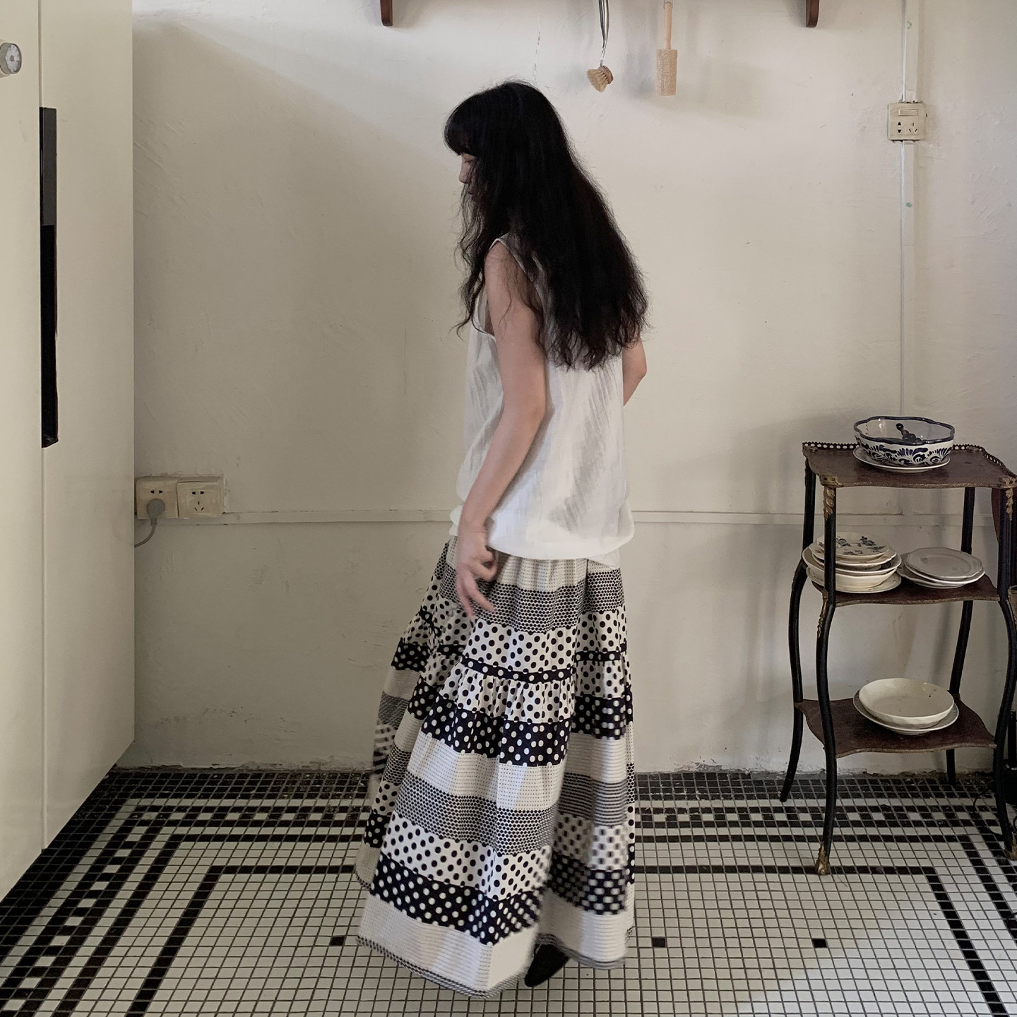 【寒菊】拼接设计撞色波点半身裙