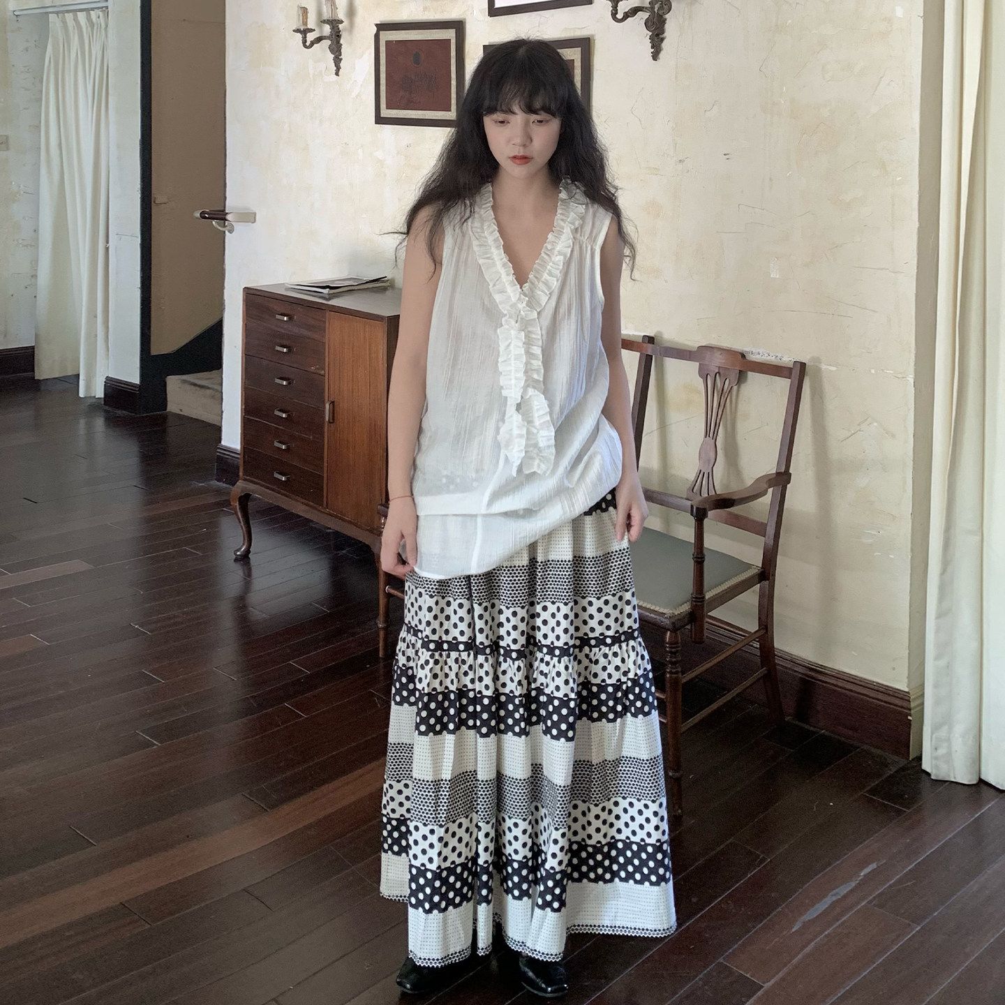 陆与山屿【寒菊】拼接设计感小众撞色波点夏季薄款百褶A字半身裙