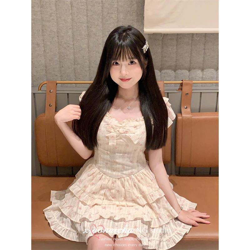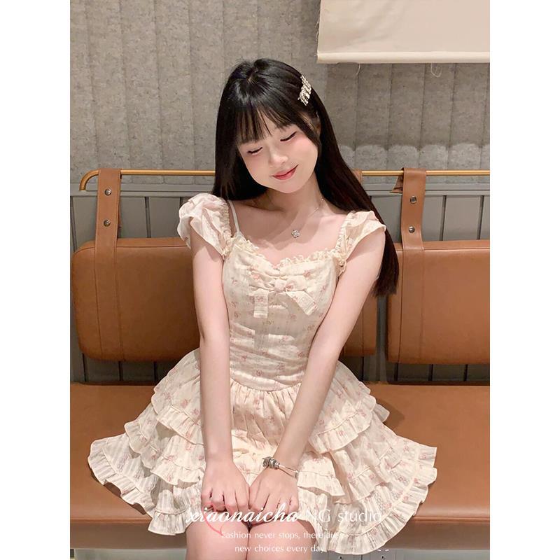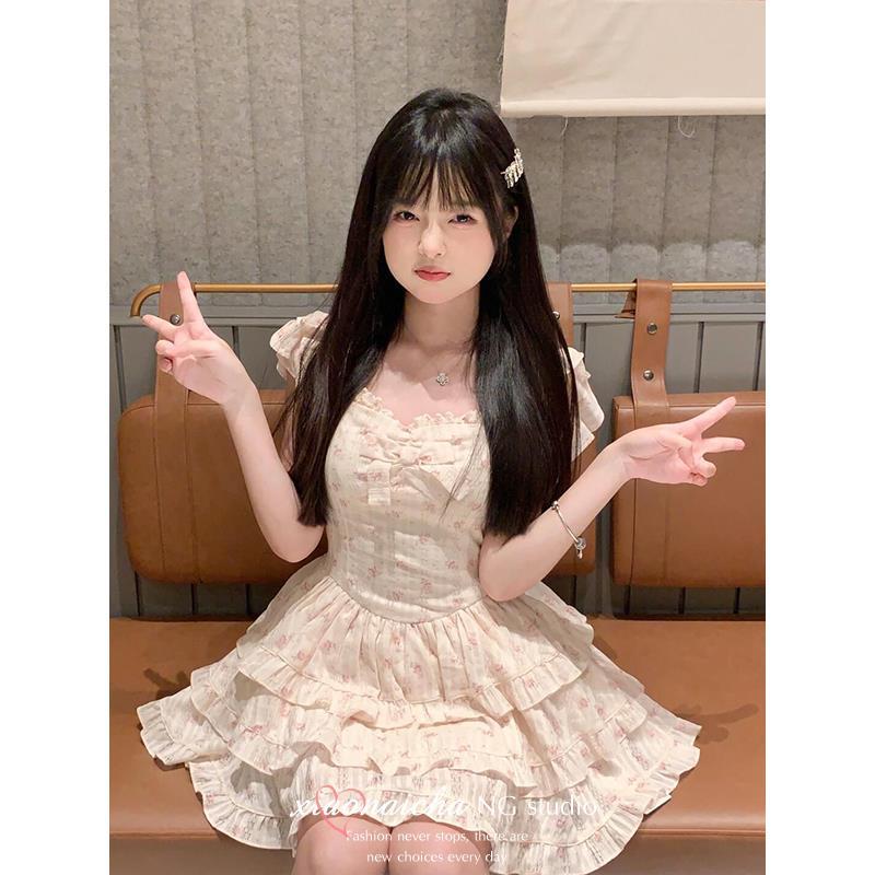 法式甜美小飞袖碎花连衣裙女夏季小个子蝴蝶结收腰在逃公主蓬蓬裙