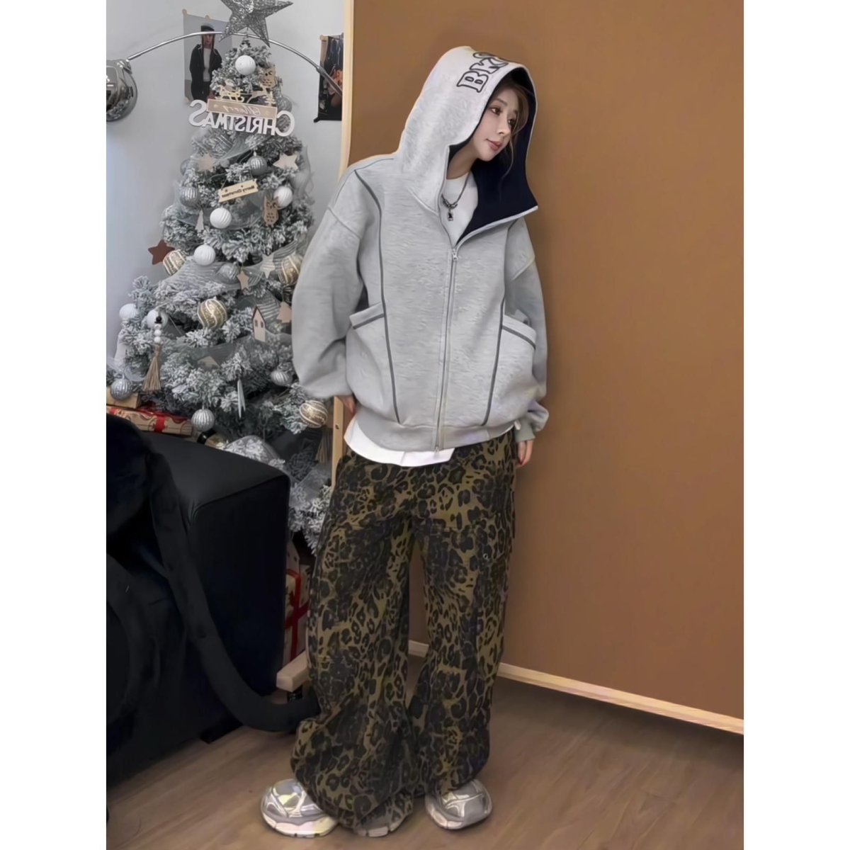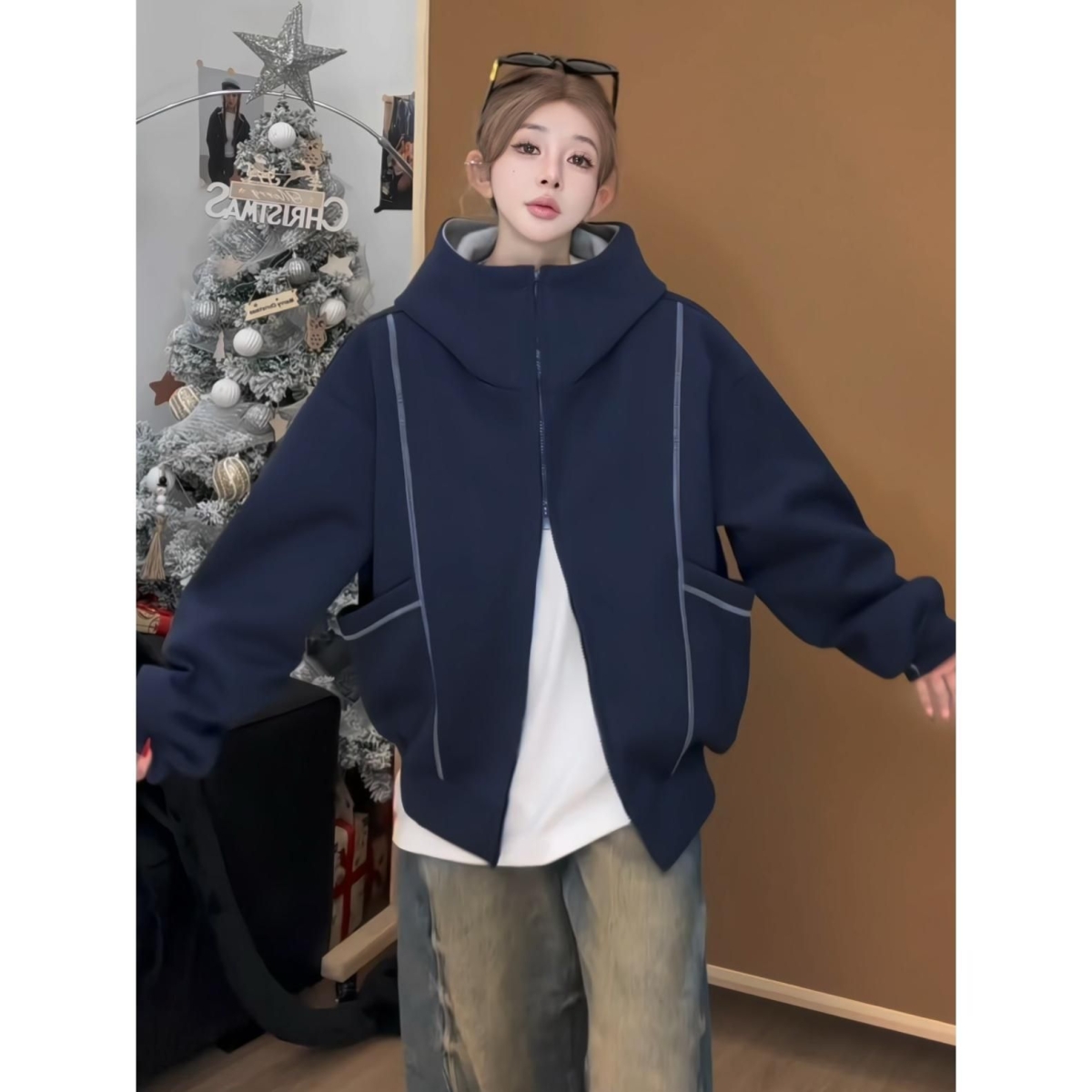 漂亮炮灰春季刺绣字母明线连帽卫衣外套男女情侣国潮上衣美式拉链