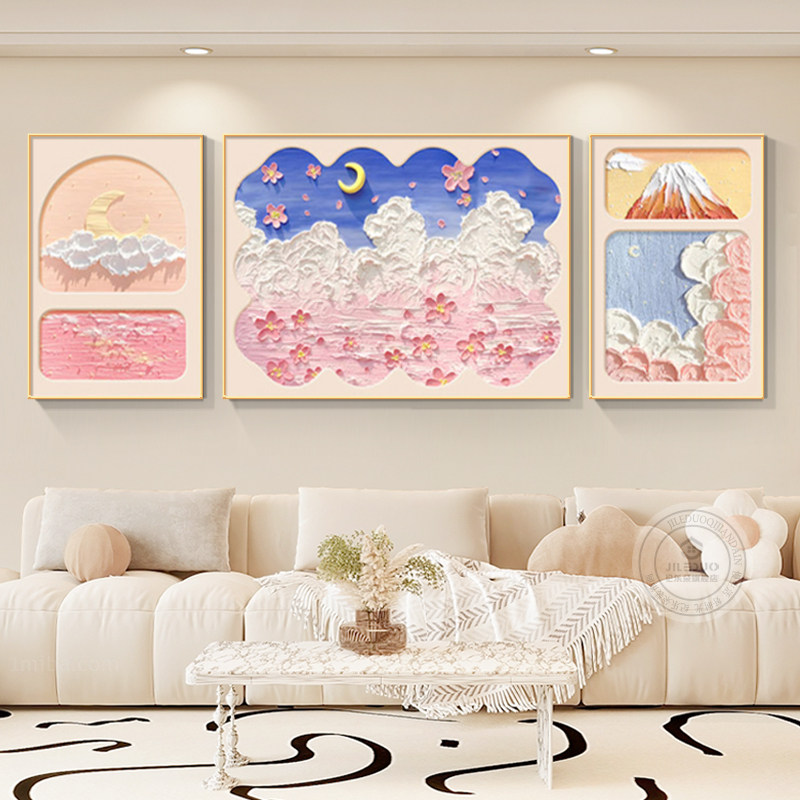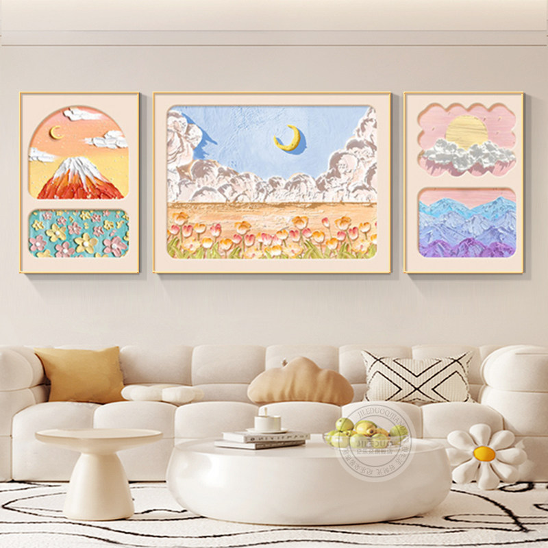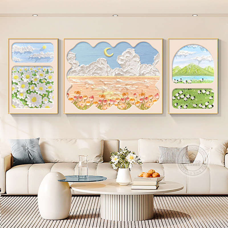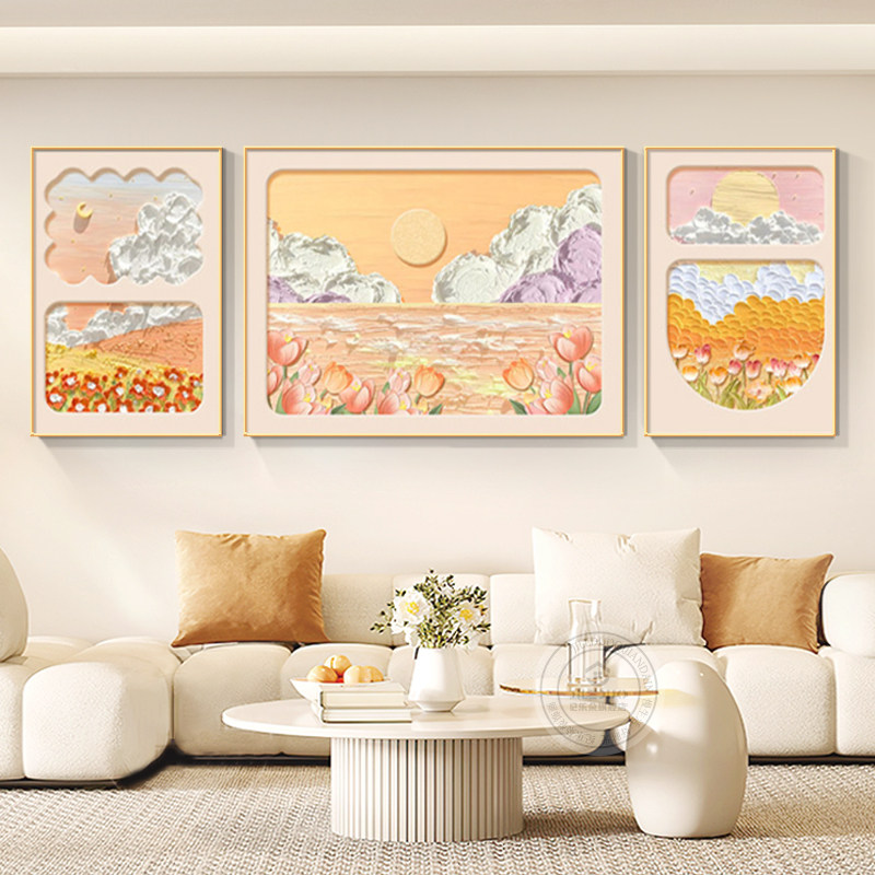 奶油风客厅装饰画治愈花卉沙发背景墙挂画北欧 ins风肌理感三联画