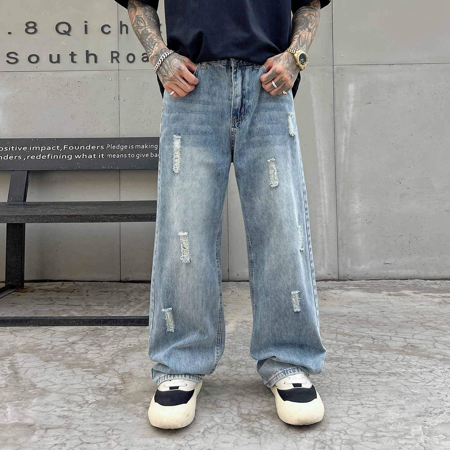 裤子男秋冬破洞牛仔裤男宽松直筒潮流百搭休闲水洗做旧男生长裤
