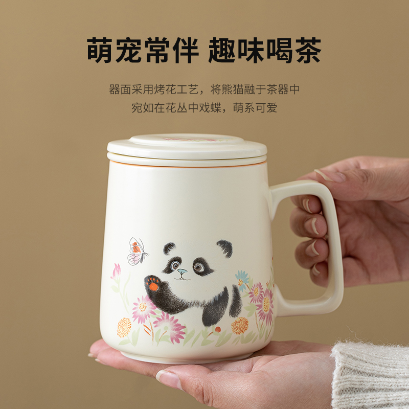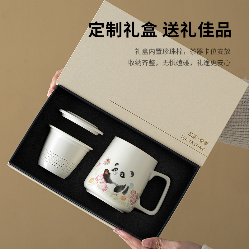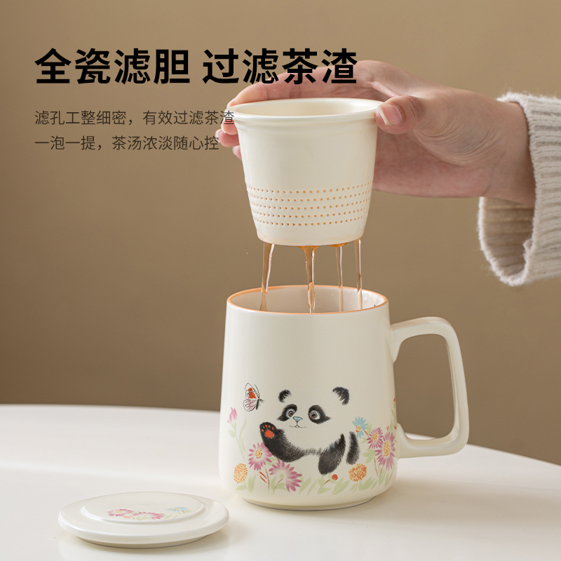 熊猫陶瓷泡茶杯茶水分离杯个人专用办公带盖过滤水杯马克杯子定制