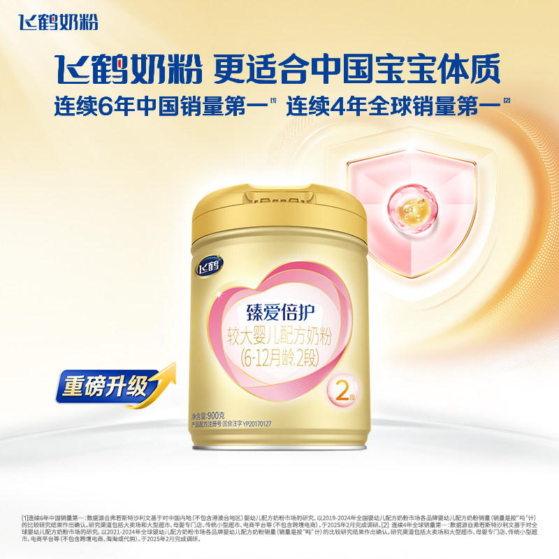 【官方正品】飞鹤臻爱倍护2段乳铁蛋白婴幼儿牛奶粉900g*6罐