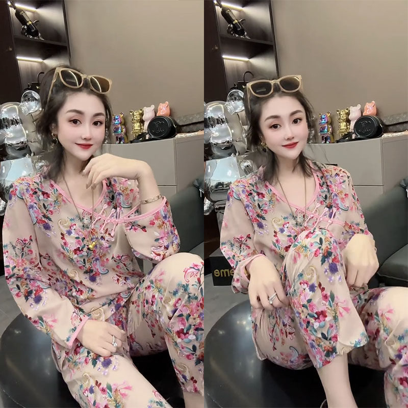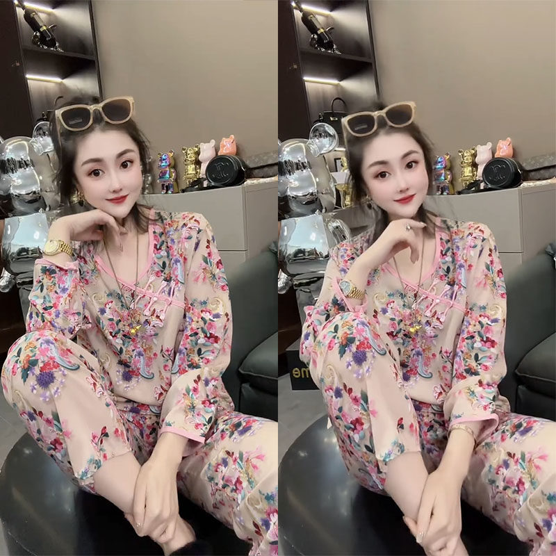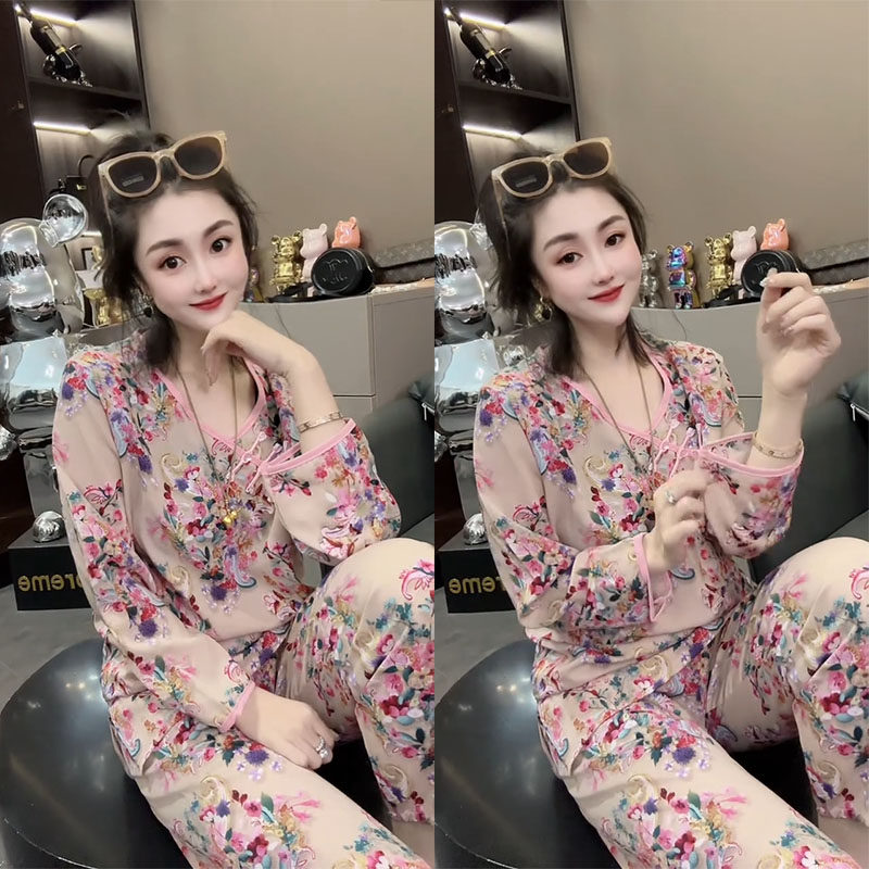 春夏薄款睡衣女套装网红时尚印花休闲宽松洋气气质中式国风家居服