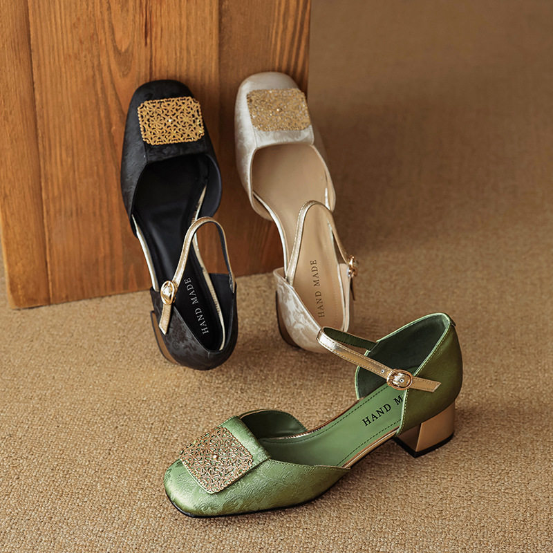 牛皮版~国风新中式包头凉鞋女夏法式中空一字带方头粗跟中跟单鞋