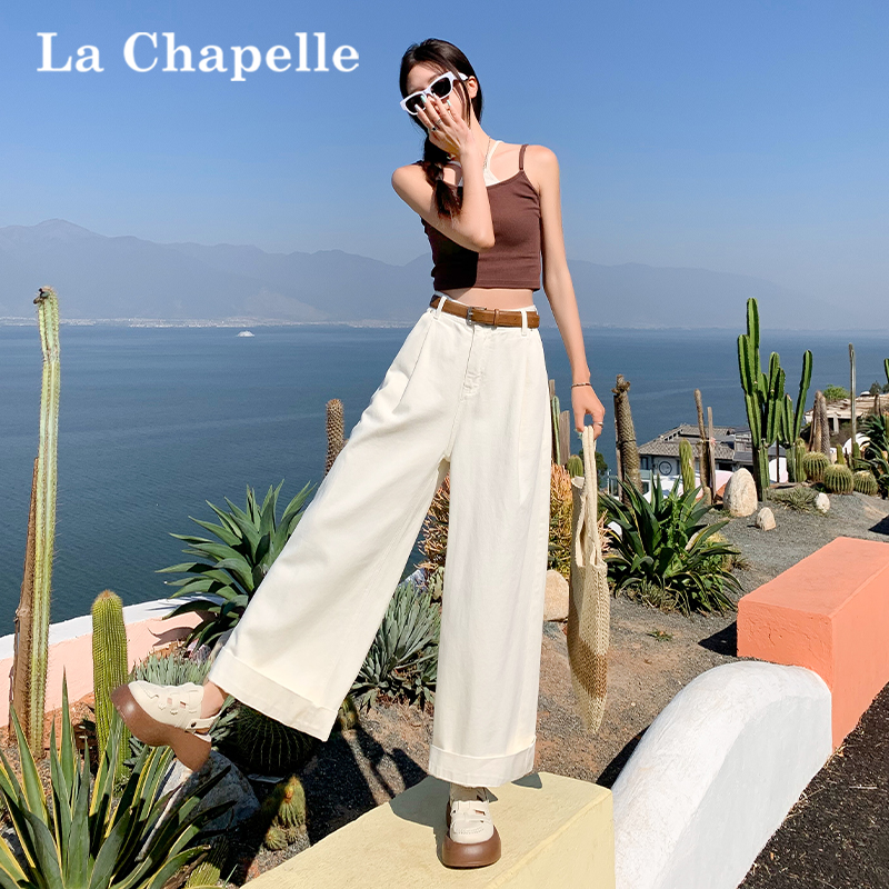 拉夏贝尔奶杏色高腰阔腿牛仔裤女