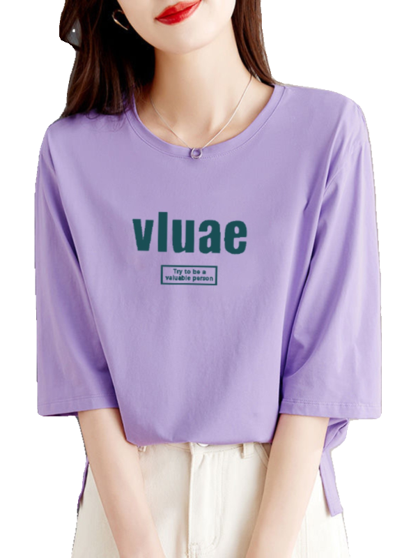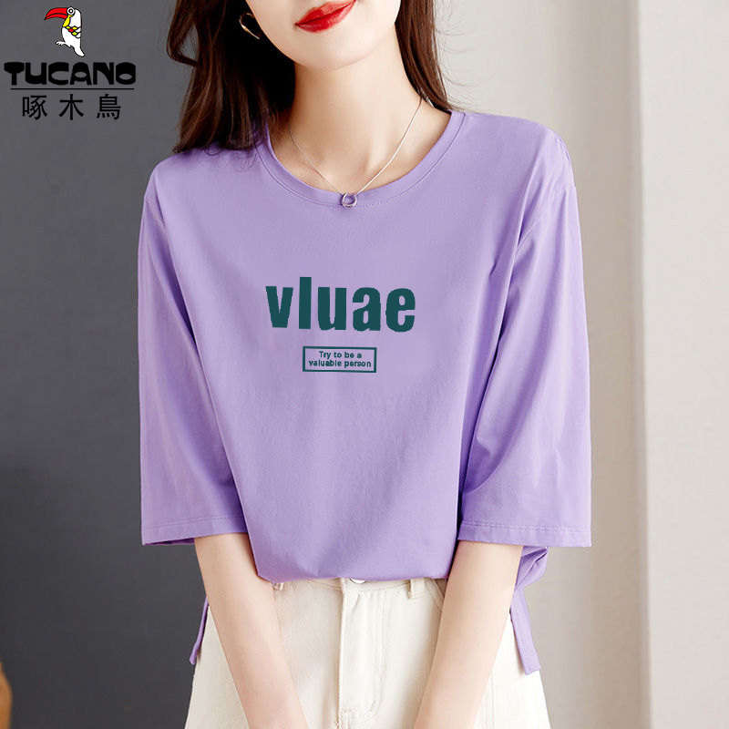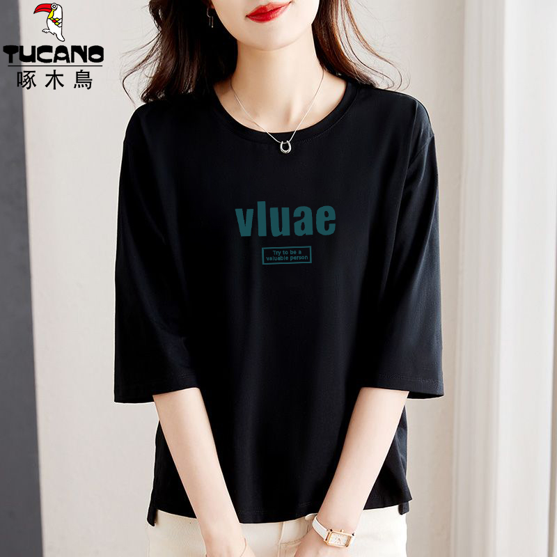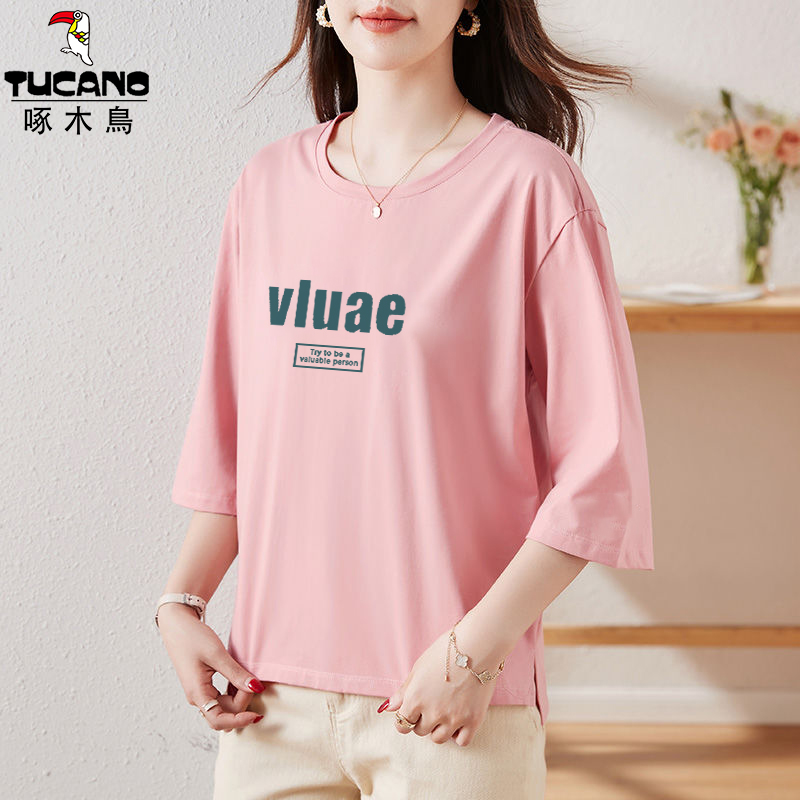 啄木鸟纯棉七分袖t恤女上衣新款2024夏季爆款宽松女装圆领体恤衫