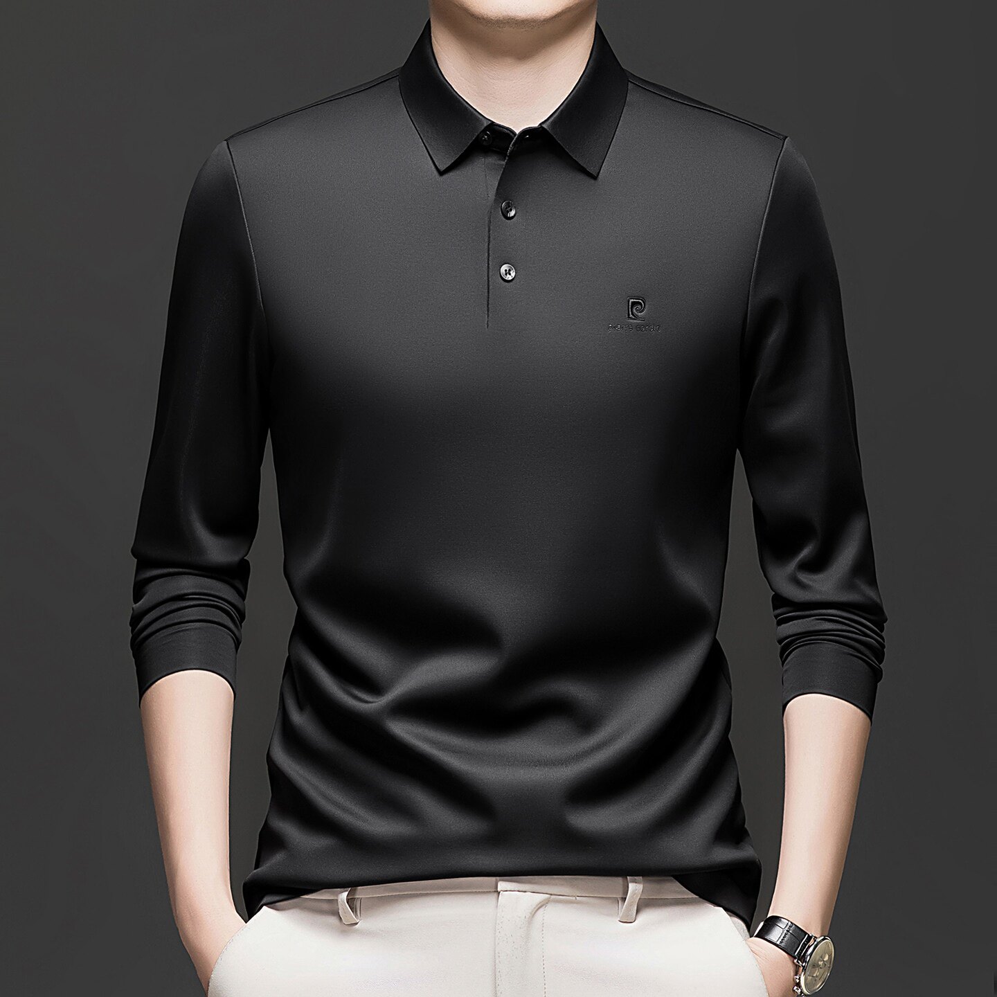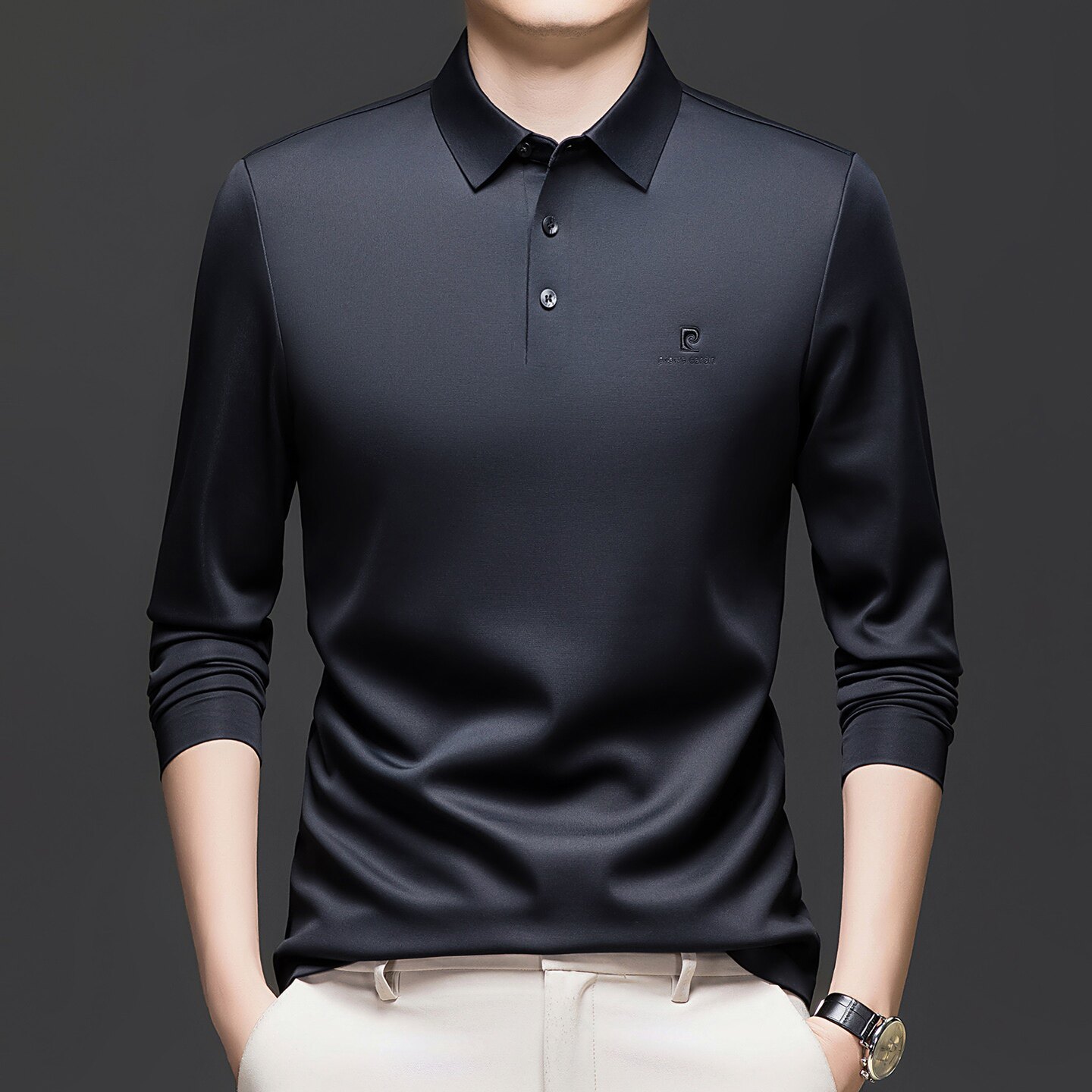 皮尔卡丹加绒加厚男士桑蚕丝长袖t恤中年商务休闲体恤翻领POLO衫