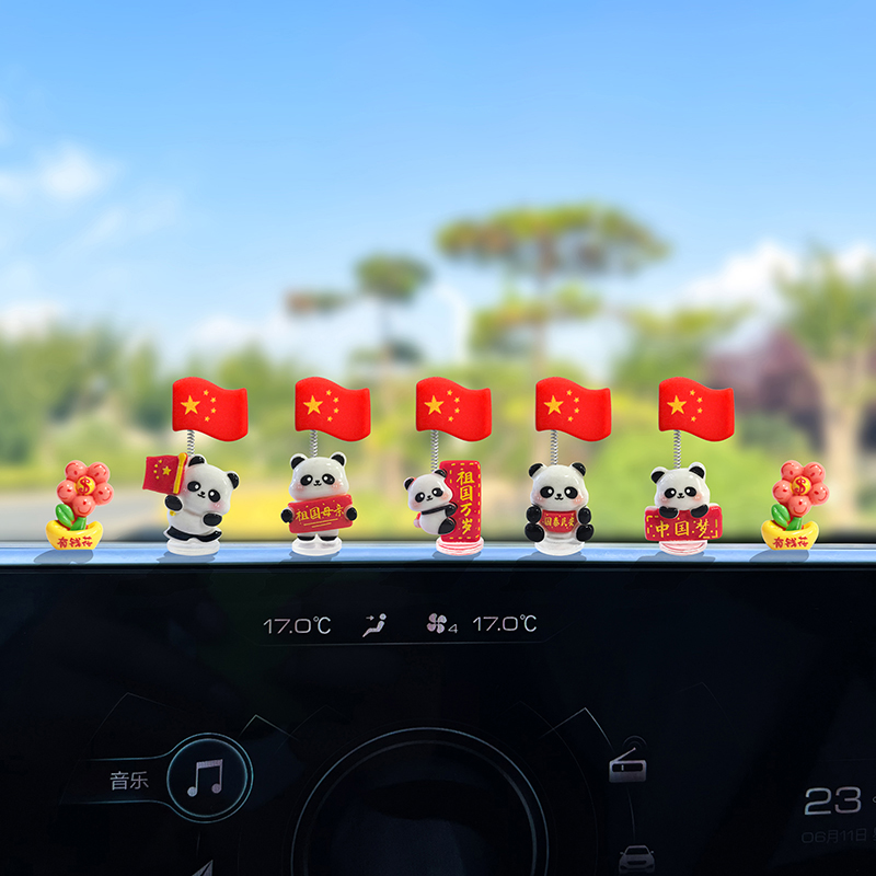 新款祝福熊猫摇头五星红旗汽车摆件车载中控台办公桌面减压装饰品