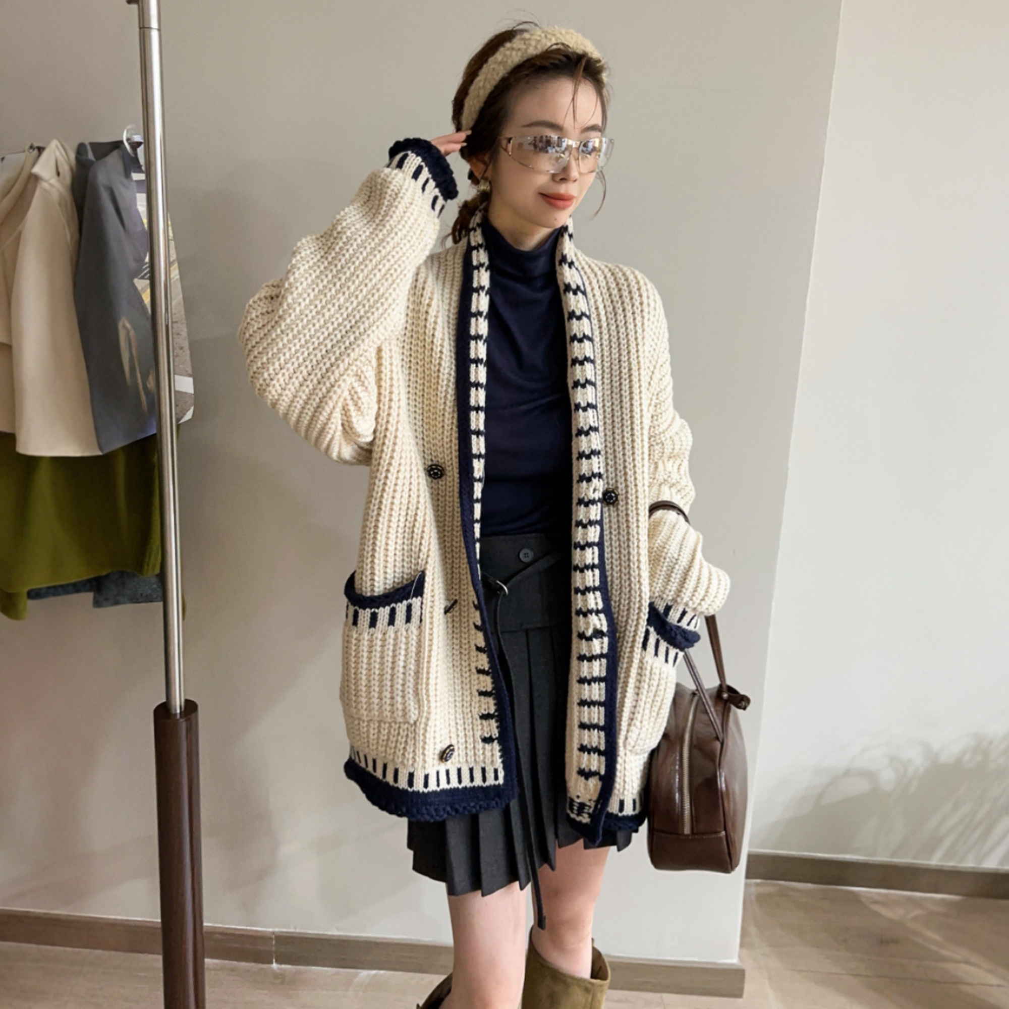 撞色粗线山羊绒针织开衫女欧洲站2025秋装新款欧货女装毛衣外套潮