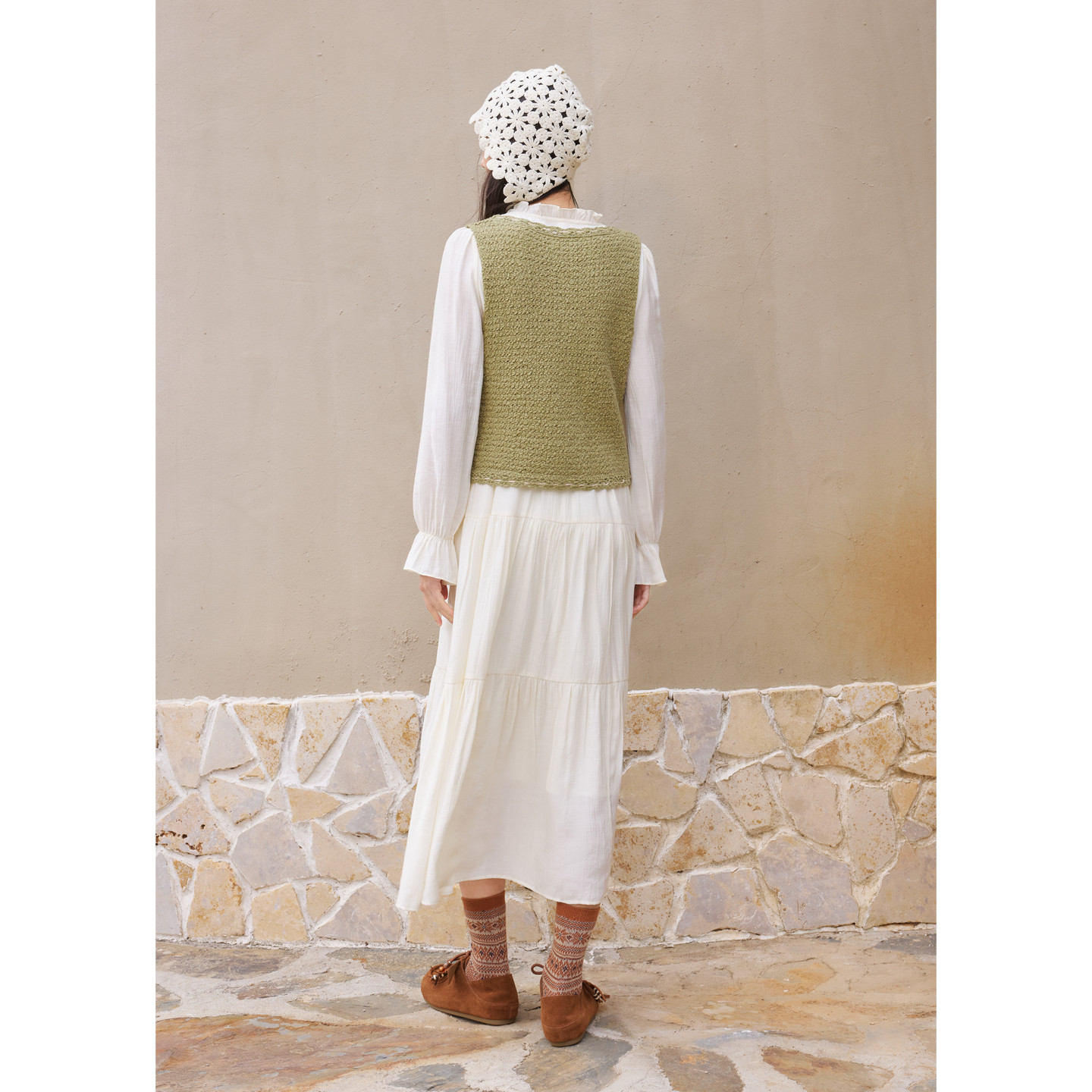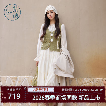 紫涵绿色针织马甲背心长袖a字拼接连衣裙两件套装女2026春季新款