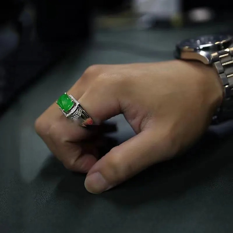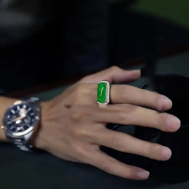 S925镀银天然翡翠玉髓男款高冰冰种满绿马鞍戒指百搭开口可调节