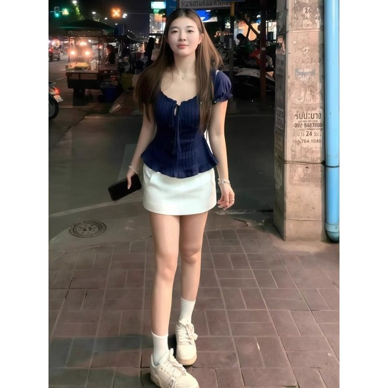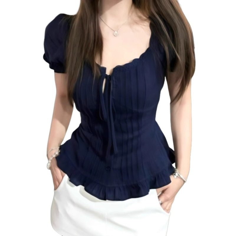 大码藏蓝色蝴蝶结蕾丝花边短袖衬衫女2025夏季新款纯欲风显瘦衬衣
