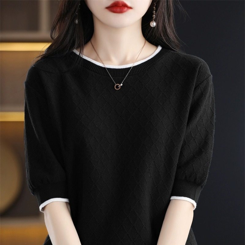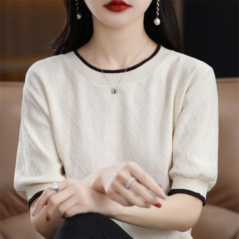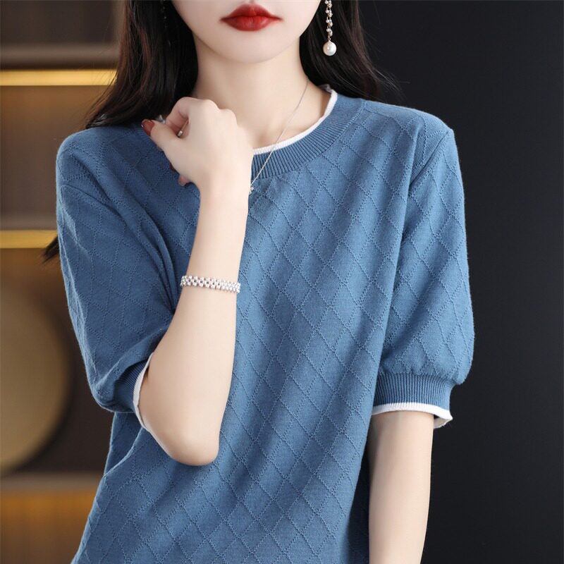 夏季新款拼色棉麻针织圆领短袖T恤女菱形百搭纯棉线宽松半袖上衣