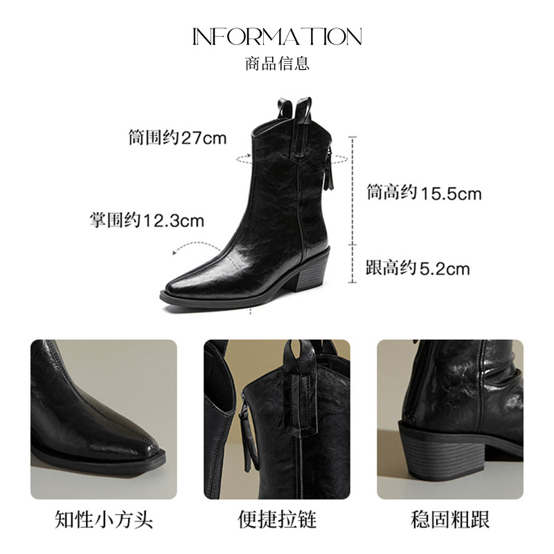 大东时装靴2025冬季新款时尚方头高跟粗跟后拉链短靴女鞋D0181