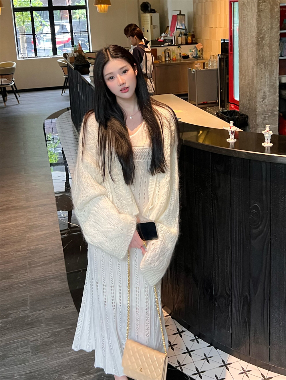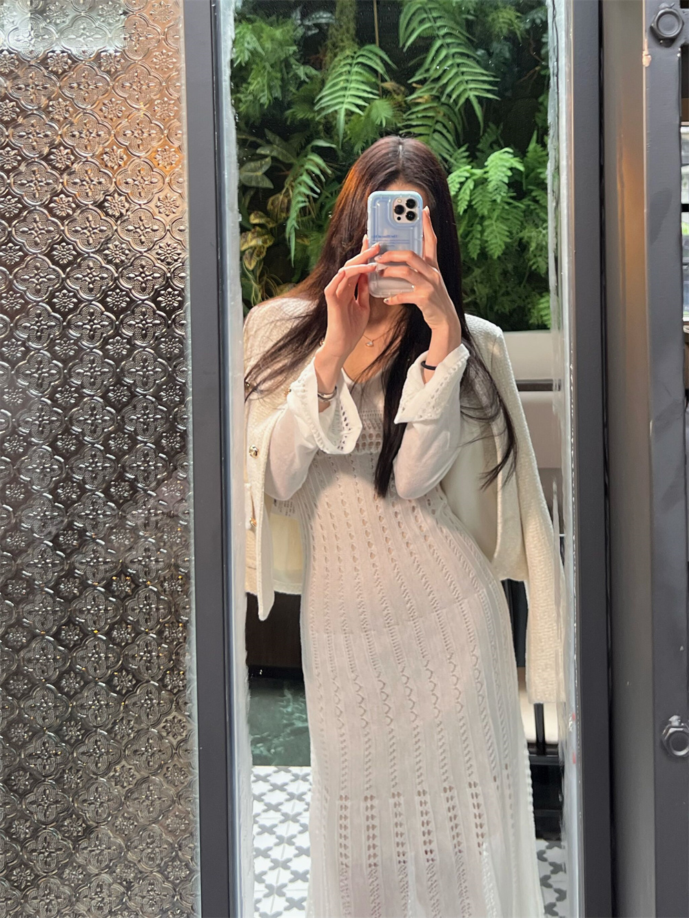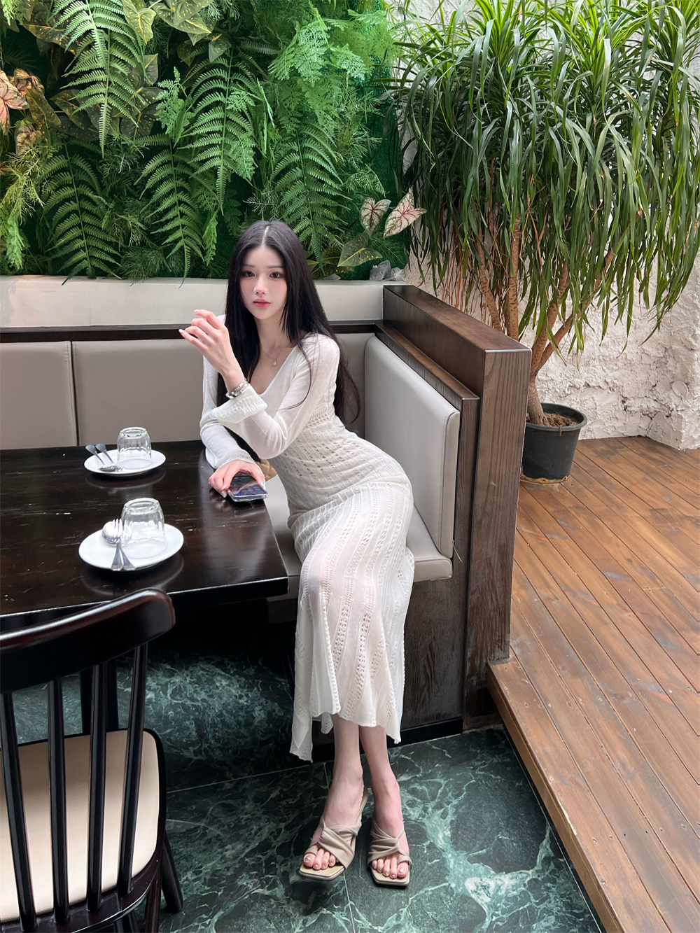 green大姐姐【温香软玉】修身气质V领镂空花针织连衣裙长袖秋内搭