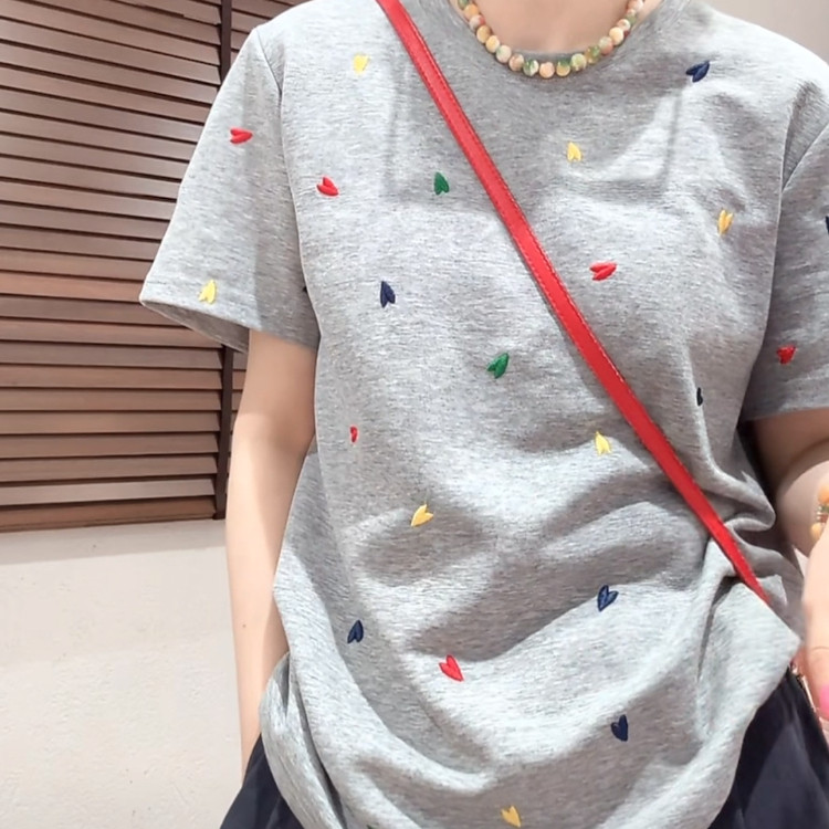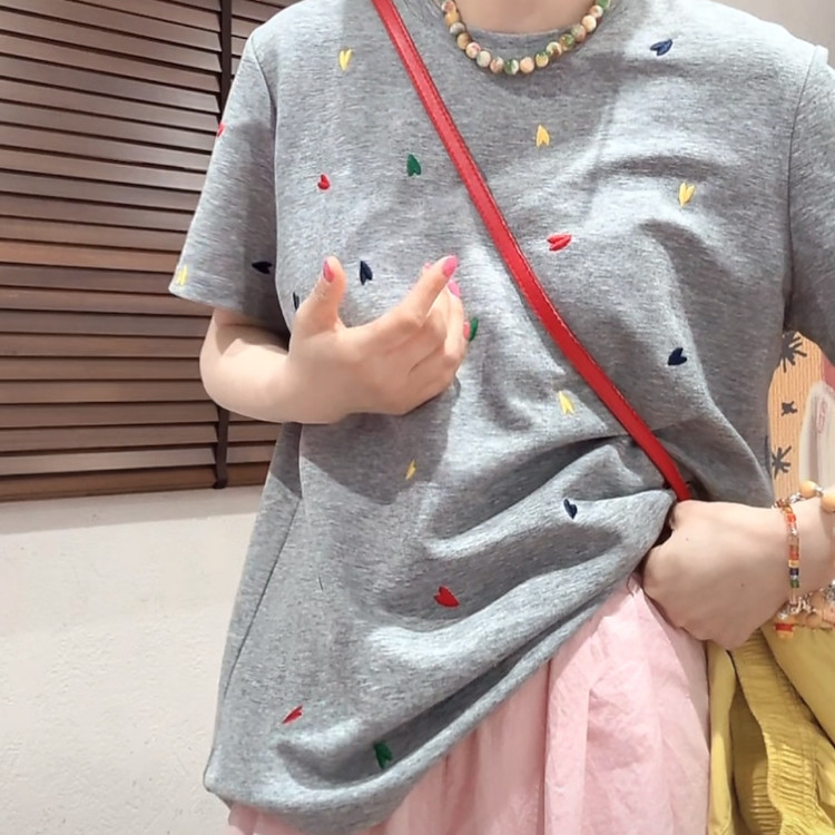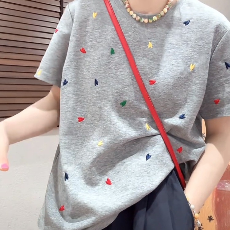 彩色小爱心刺绣圆领短袖T恤女2025夏季新款百搭休闲中长款上衣ins