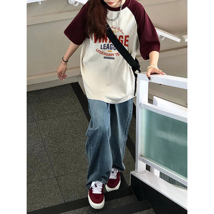 夏季女装美式复古纯棉短袖t恤女新款胖mm显瘦插肩设计感宽松上衣