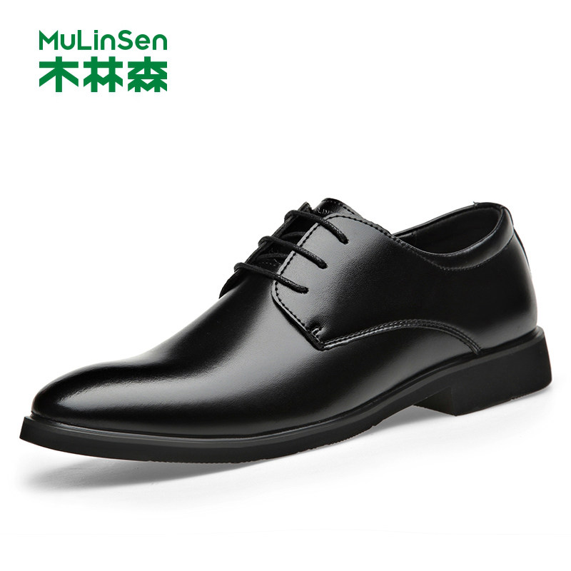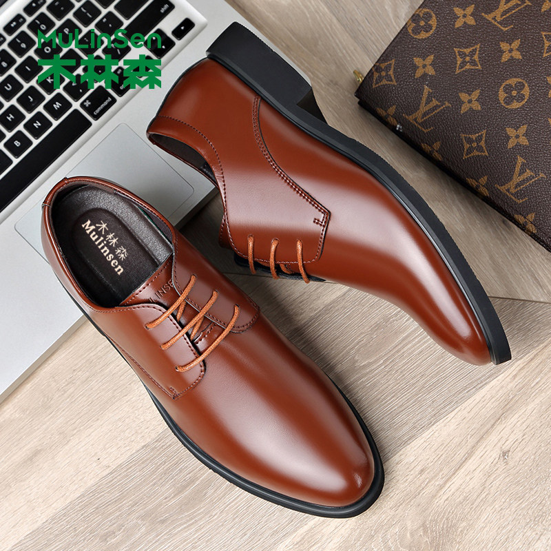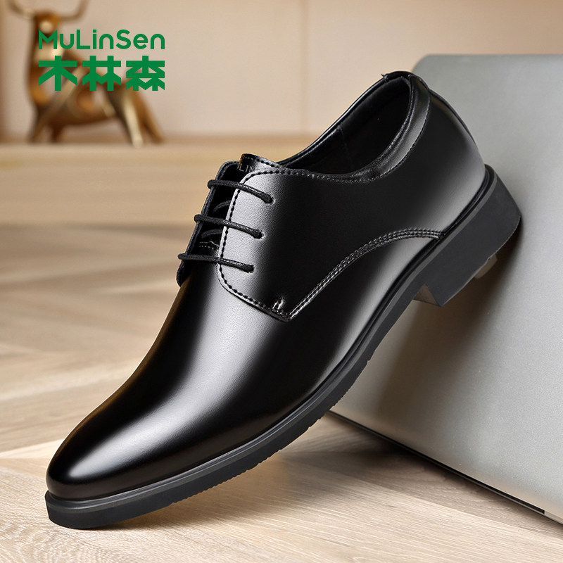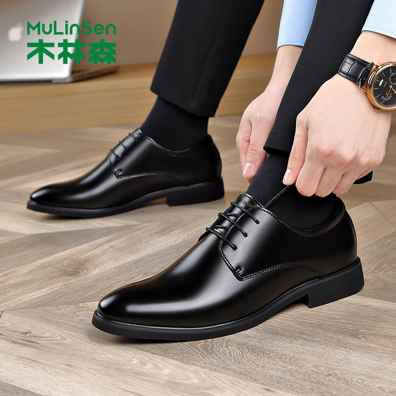 木林森皮鞋男冬季真皮商务正装西装休闲尖头厚底爸爸婚礼新郎潮鞋