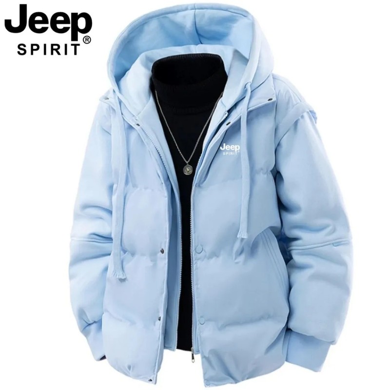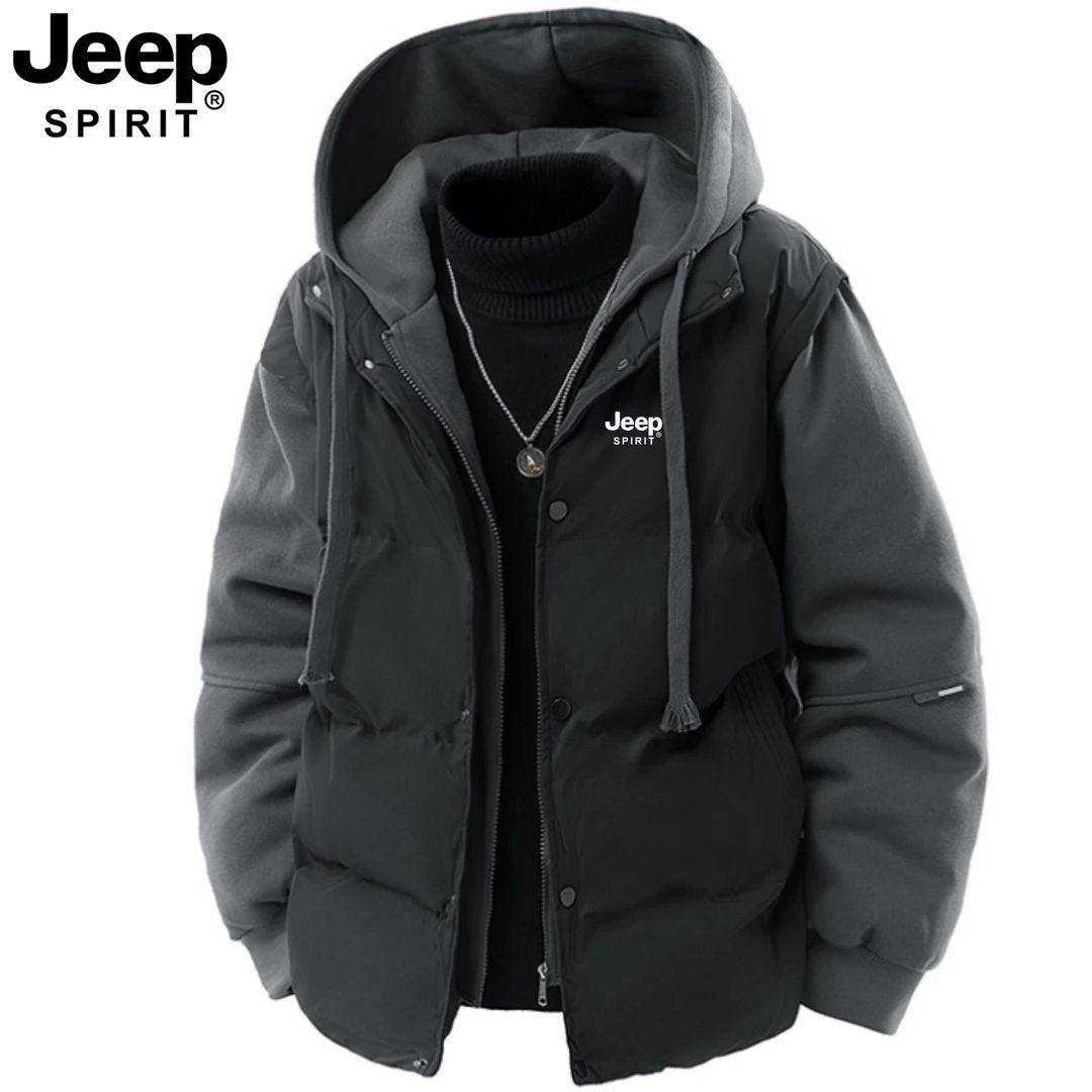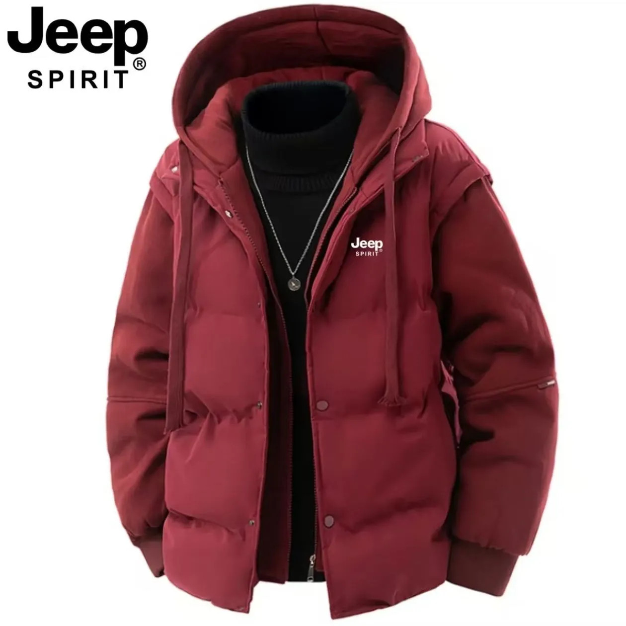 吉普JEEP棉衣保暖外套厚冬季纯色休闲假两件羽绒棉服男士连帽男装
