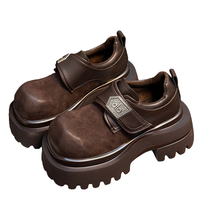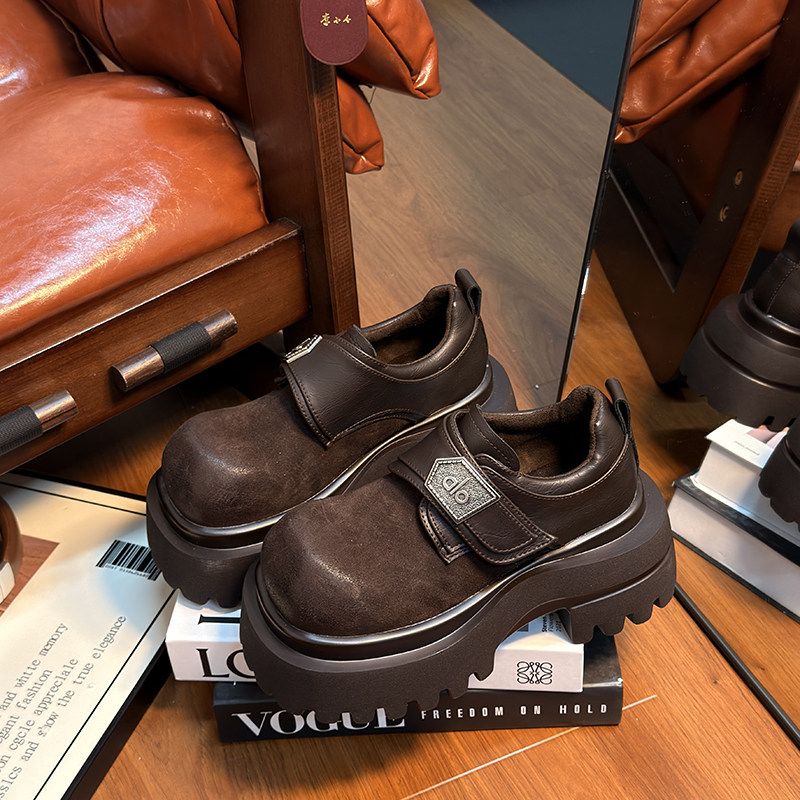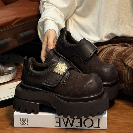 复古真皮松糕厚底小皮鞋女英伦风圆头德比鞋小个子增高加绒乐福鞋