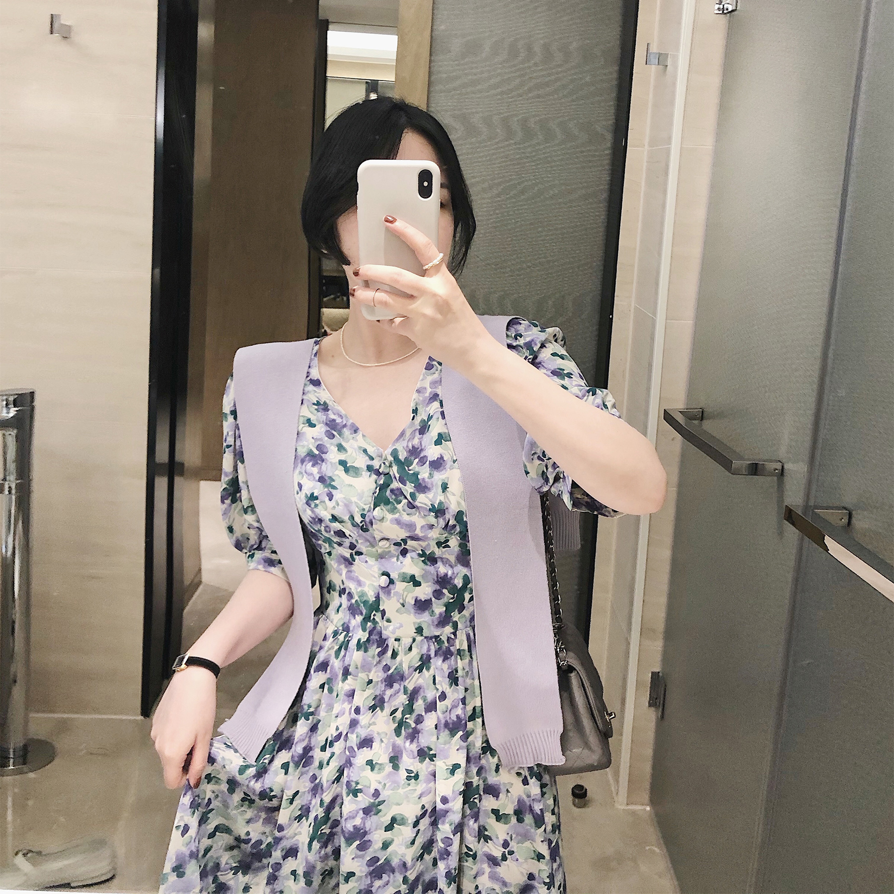 misslady法式复古韩国v领高腰收腰紫色碎花连衣裙设计感小众女夏