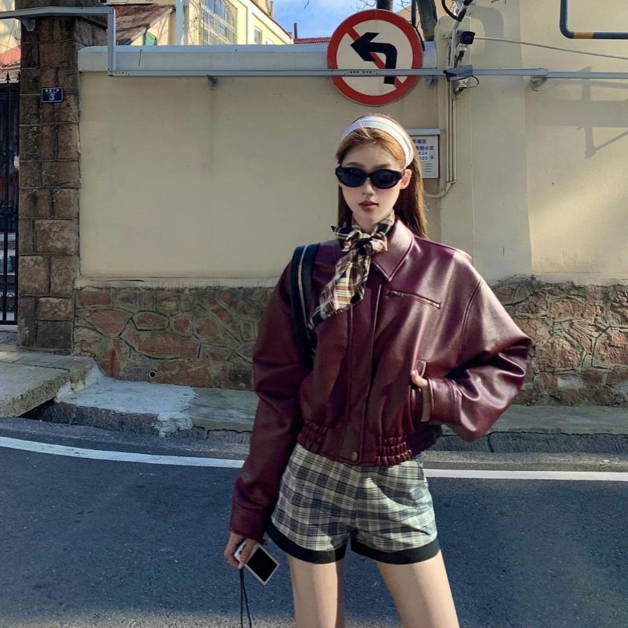 曼尼时差 红色复古皮衣机车夹克春秋女美式翻领短外套