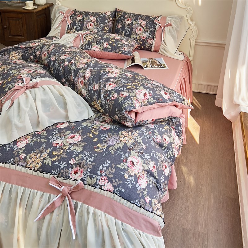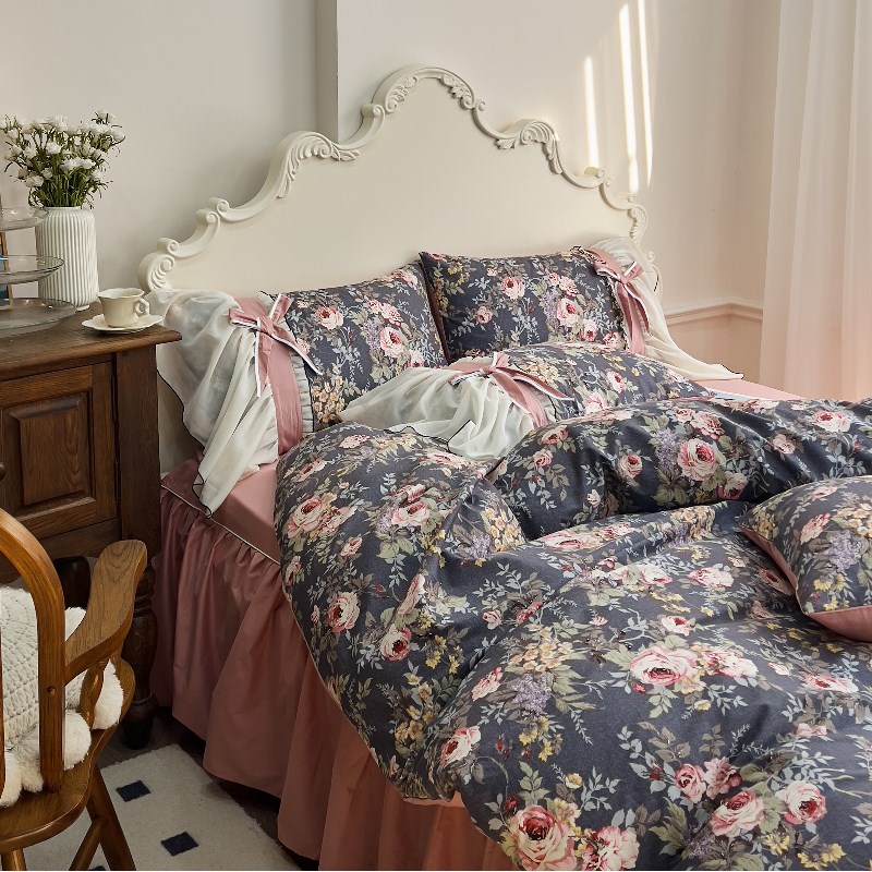 全棉复古油画感玫瑰花法式公主床裙款四件套纯棉蕾丝花边被套床品
