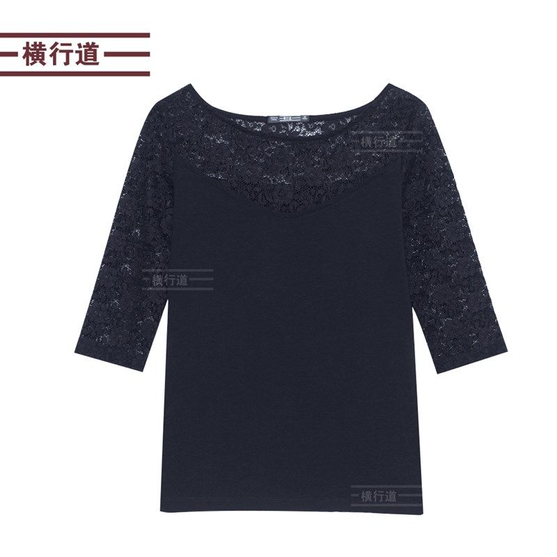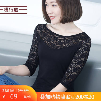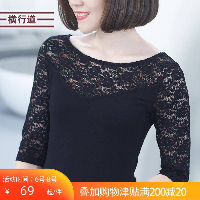 t恤纯棉半截袖2021秋装新款蕾丝七分袖一字领黑色中袖打底衫女士
