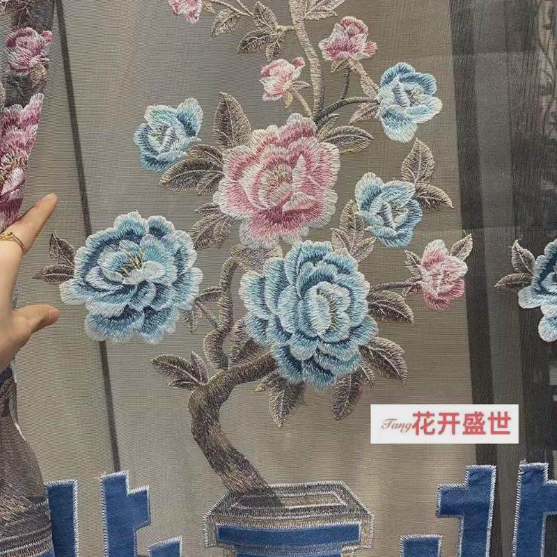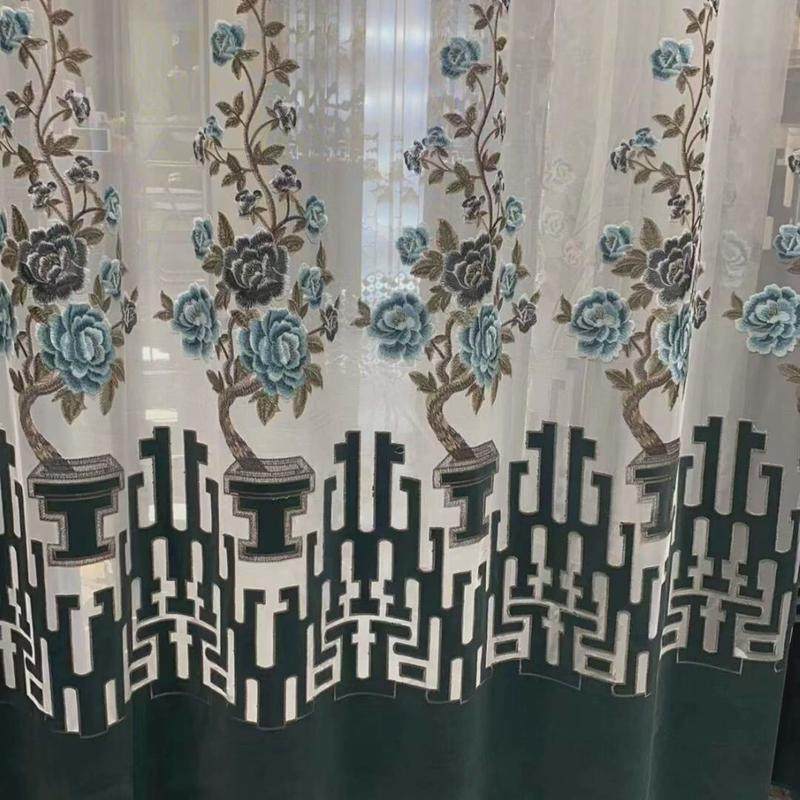 高档新中式大气定制客厅绒布绣花窗帘成品卧室遮光落地窗飘窗纱帘