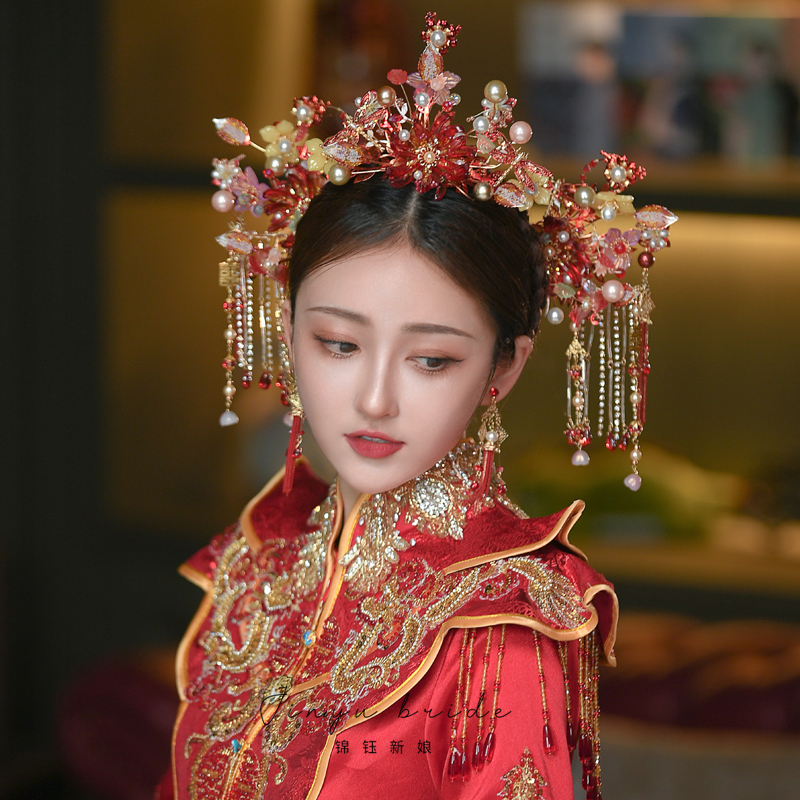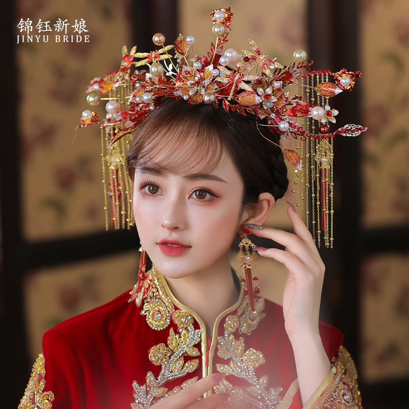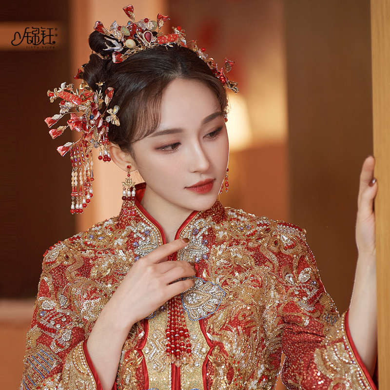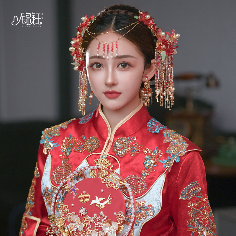锦钰秀禾新娘古装头饰步红色摇流苏套装中式婚礼大气秀禾服发饰女