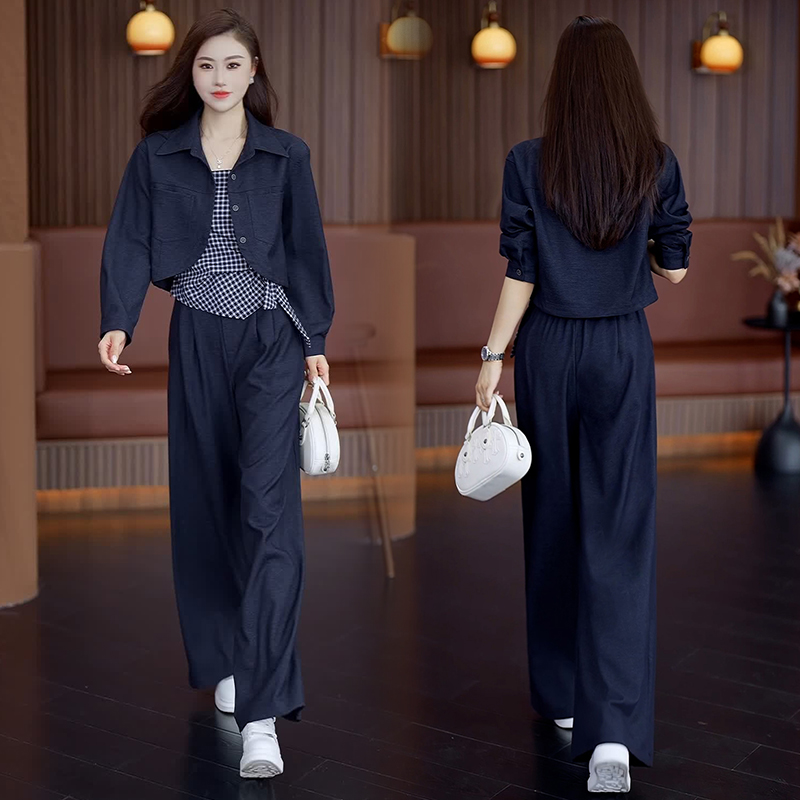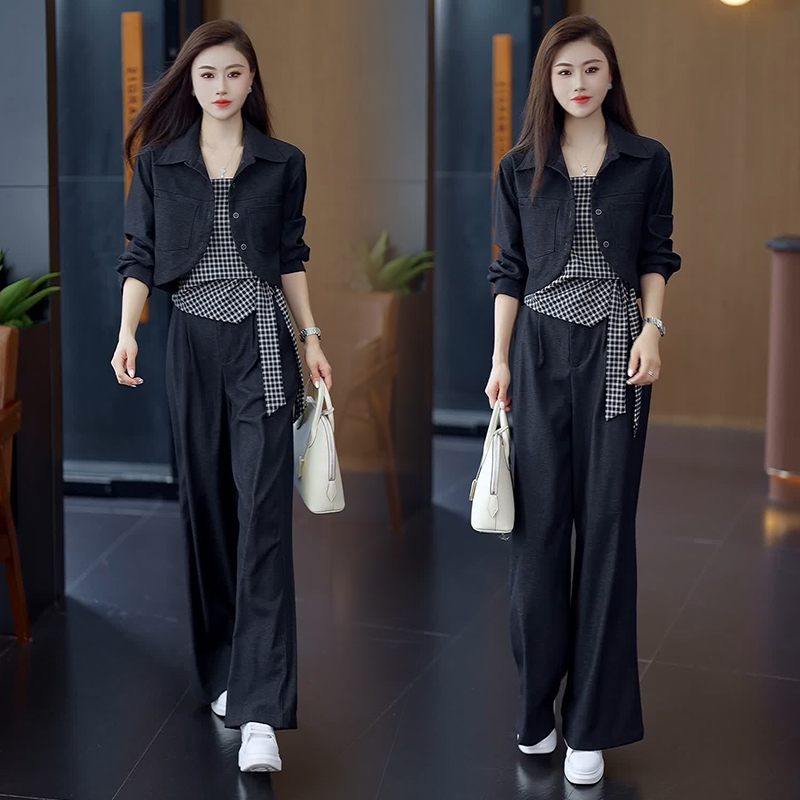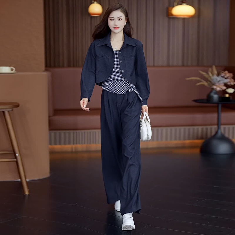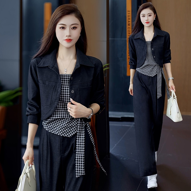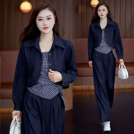 天丝牛仔套装女士春秋新款休闲格子吊带开衫短款外套阔腿裤三件套