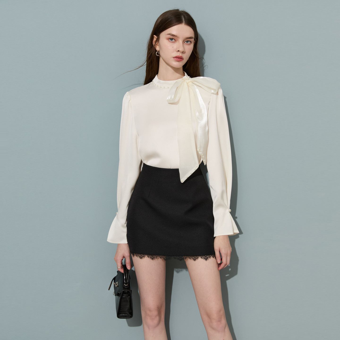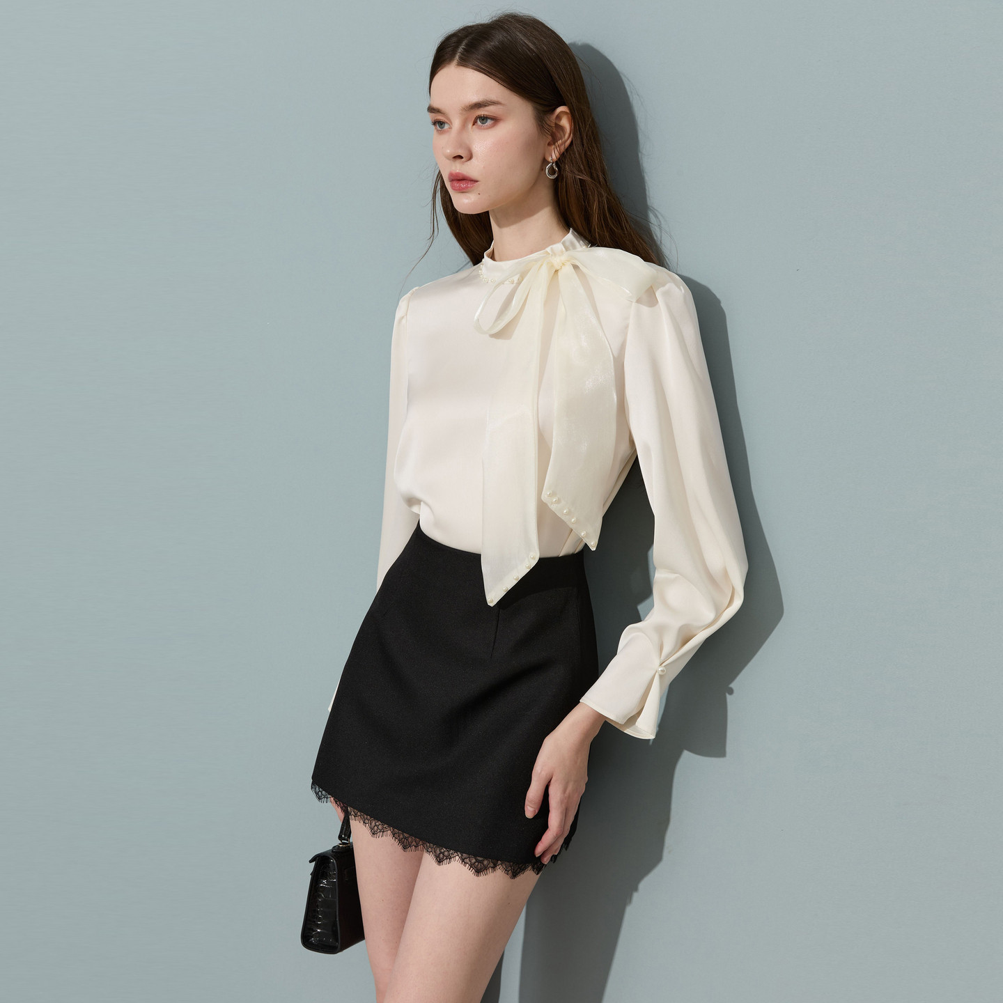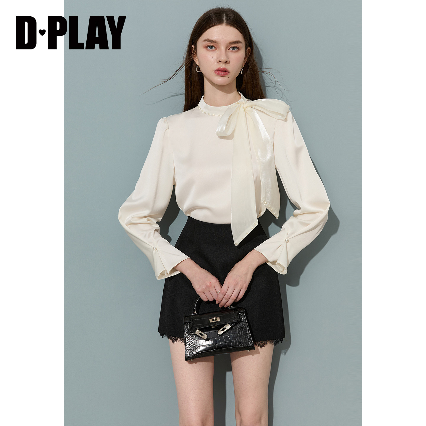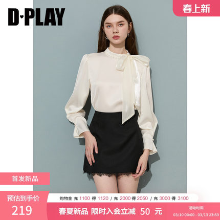 DPLAY米白色蝴蝶结系带缎面衬衫2026年春季新款通勤气质女衬衣
