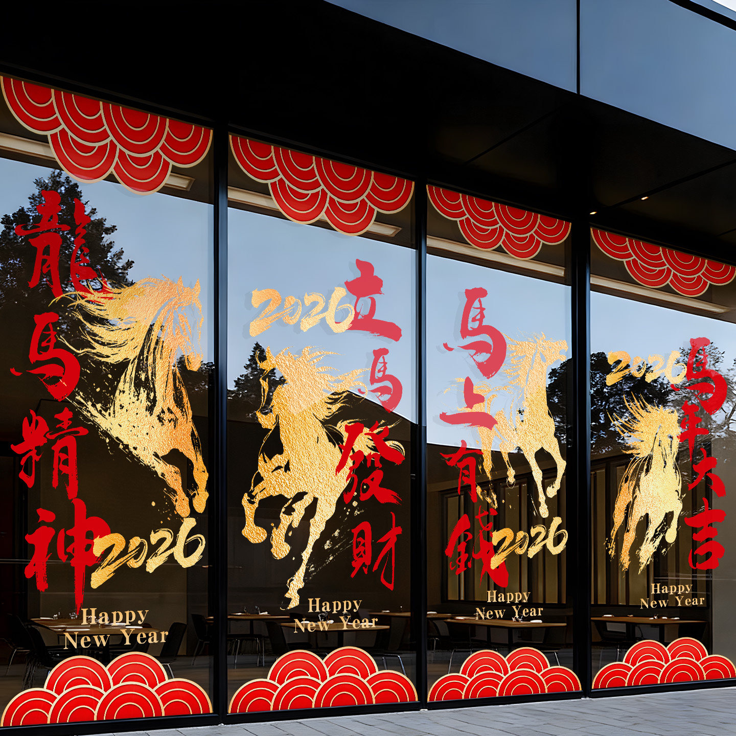 2026新款马年装饰新年快乐窗花静电玻璃贴纸春节过年氛围窗贴门贴